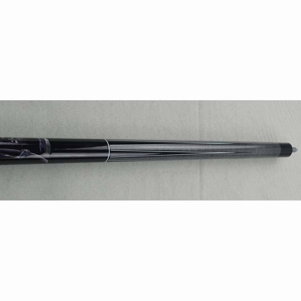 La culata del taco de billar Buffalo Poolball Fun modelo 1 está fabricada en madera dura gris y presenta un estampado UV de triángulos negros con líneas blancas por encima y por debajo de la empuñadura. La empuñadura, pintada en negro, luce un llamativo estampado UV de bola 8 y esqueleto. Este taco de dos piezas tiene una longitud total de 147,32 cm; tanto la culata como la flecha miden 73,66 cm. La flecha de este taco Buffalo de gama media está fabricada en madera dura y cuenta con una punta roscada de 12 mm de diámetro. El taco incorpora una virola de policarbonato de 12 mm y una junta de 18 dientes.