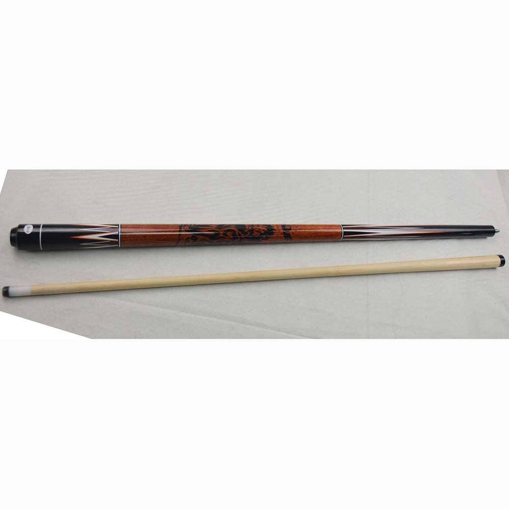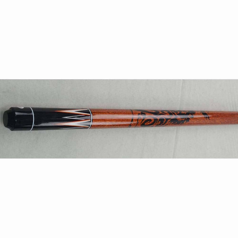 La culata del taco de billar Buffalo modelo 5 de Poolball Fun está hecha de madera dura de color negro y decorada por encima y por debajo de la empuñadura con detalles en blanco y marrón anaranjado. La empuñadura es de 2 piezas, con una longitud total de 147,32 cm y una longitud extrema de 73,66 cm. El primer segmento de la base del taco Buffalo tiene una punta roscada de 12 mm de diámetro.