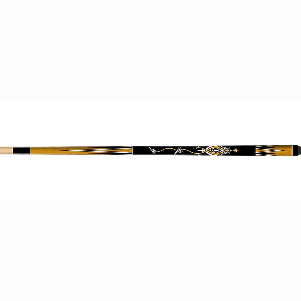 La culata del taco de billar Buffalo Poolball Fun modelo 6 está hecha de madera dura de color marrón claro y decorada con puntos blancos y negros por encima y por debajo de la empuñadura. La empuñadura, pintada de negro, presenta un llamativo estampado UV tribal y de bola 8. Este taco de dos piezas tiene una longitud total de 147,32 cm; tanto la culata como la vara miden 73,66 cm. La flecha de este taco Buffalo de gama media está hecha de madera dura y cuenta con una punta roscada de 12 mm de diámetro. El taco tiene una virola de policarbonato de 12 mm y una junta de 18 dientes.