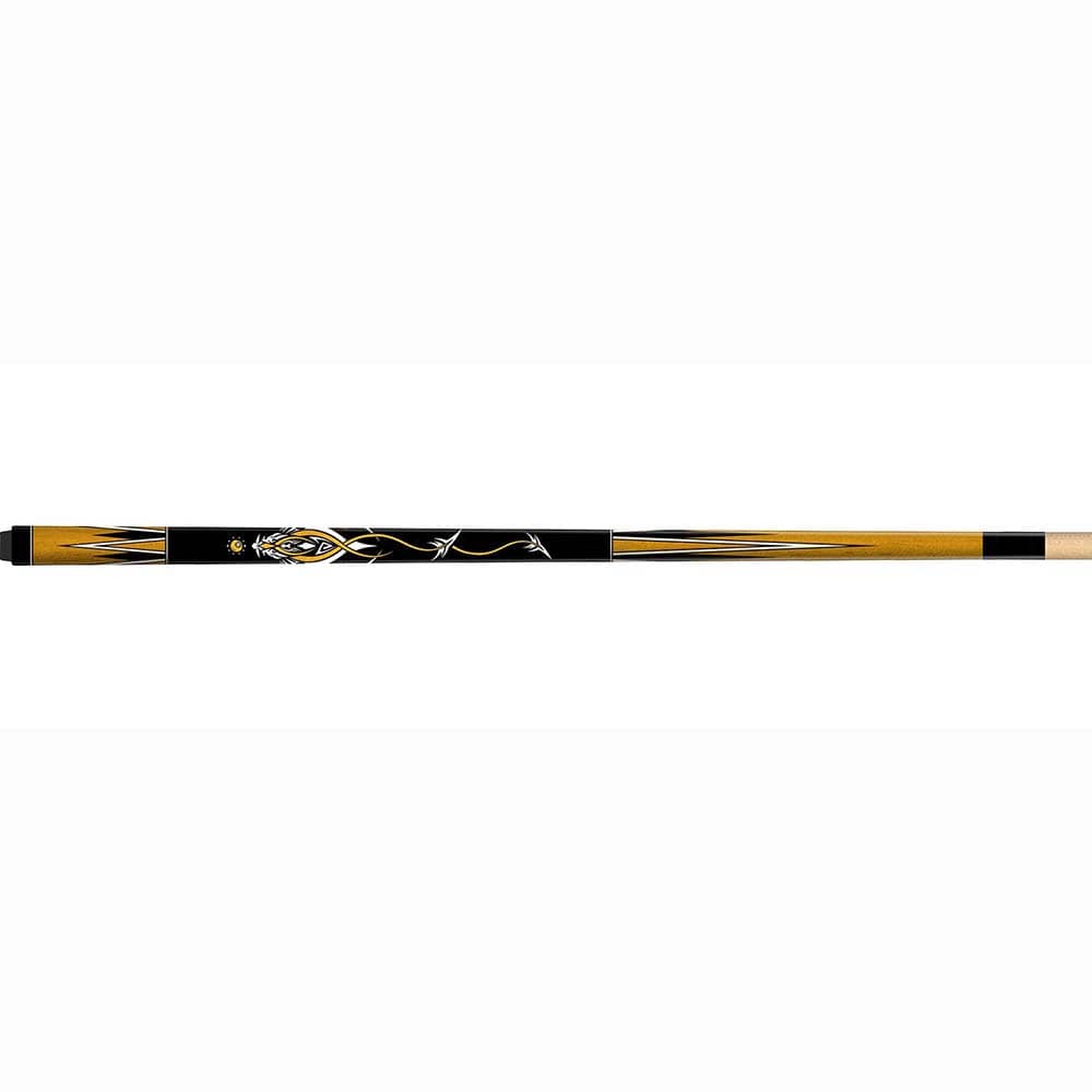 La culata del taco de billar Buffalo Poolball Fun modelo 6 está hecha de madera dura de color marrón claro y decorada con puntos blancos y negros por encima y por debajo de la empuñadura. La empuñadura, pintada de negro, presenta un llamativo estampado UV tribal y de bola 8. Este taco de dos piezas tiene una longitud total de 147,32 cm; tanto la culata como la vara miden 73,66 cm. La flecha de este taco Buffalo de gama media está hecha de madera dura y cuenta con una punta roscada de 12 mm de diámetro. El taco tiene una virola de policarbonato de 12 mm y una junta de 18 dientes.