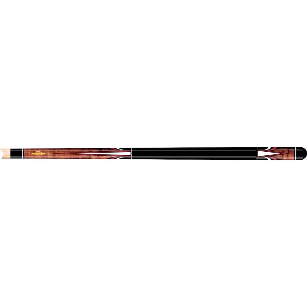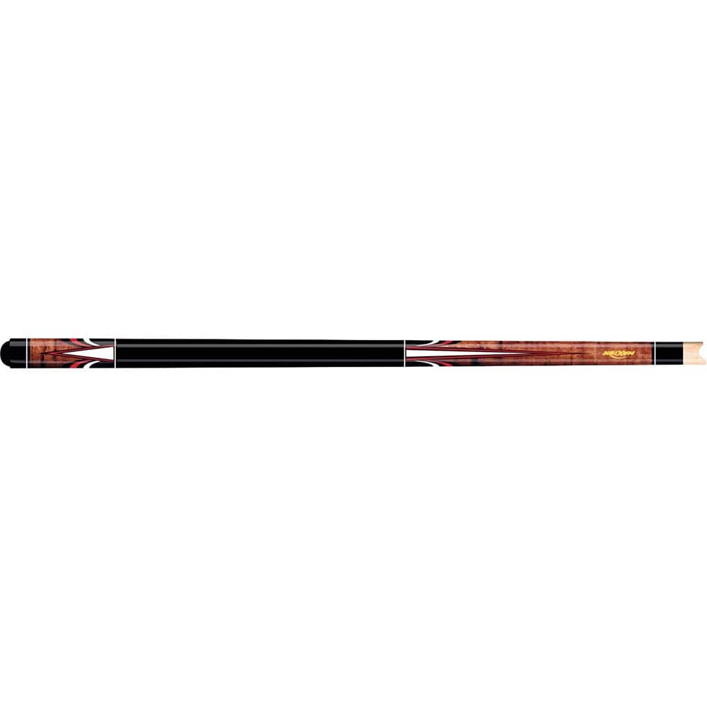 Este taco muy atractivo tiene un antebrazo y una manga de arce ojo de pájaro teñidos de marrón. Ambos cuentan con calcomanías de puntos rojas, negras y blancas, compensadas por calcomanías de mariposas rojas, negras y blancas. La empuñadura está pintada de negro, con 4 juegos de calcomanías de anillos con adornos blancos.
