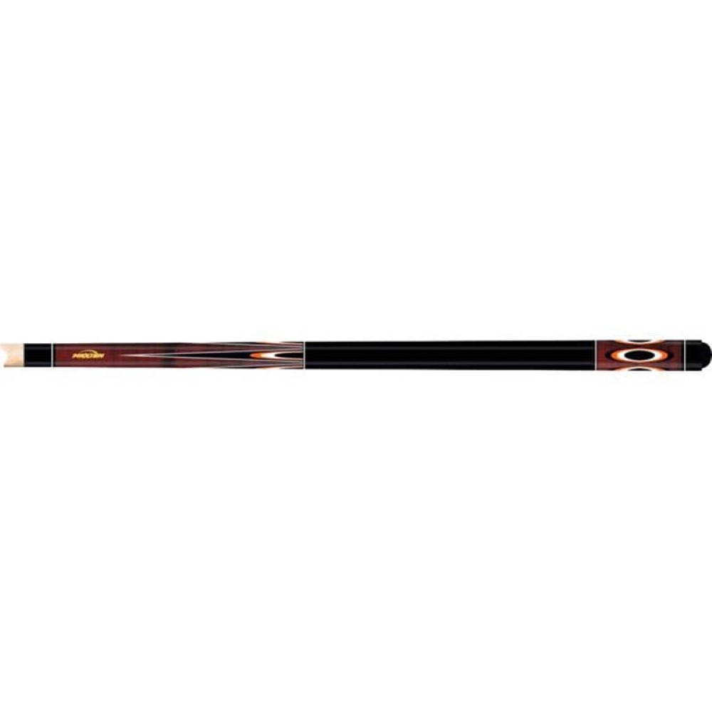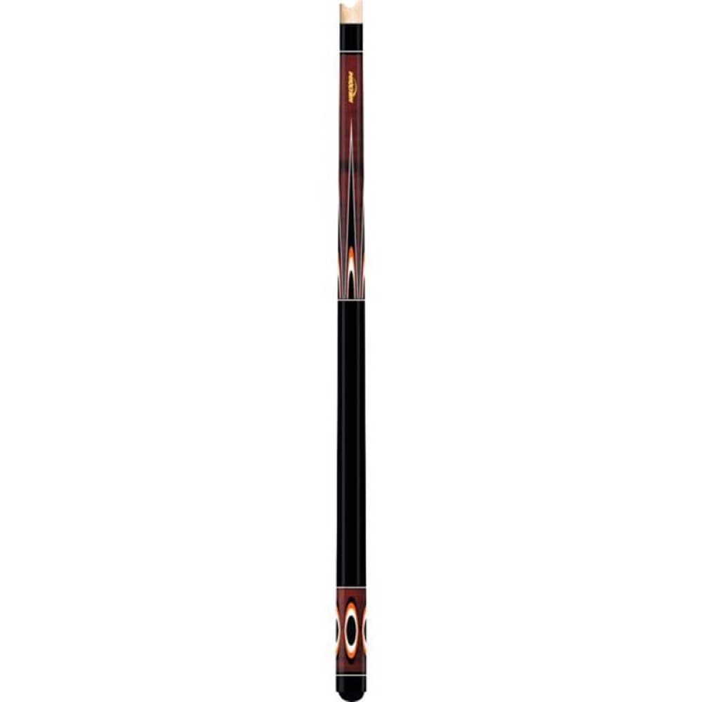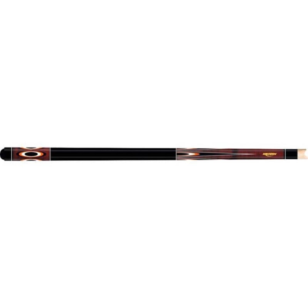Este taco muy atractivo tiene un antebrazo y una culata de arce ojo de pájaro teñido de marrón oscuro. El antebrazo presenta calcomanías de puntos naranjas, negras y blancas, insertadas con calcomanías de mariposas naranjas, negras y blancas. La funda de la culata contiene calcomanías flotantes en forma ovalada de color naranja, negro y blanco. La empuñadura está pintada de negro; con 4 juegos de calcomanías de anillos con adornos blancos.