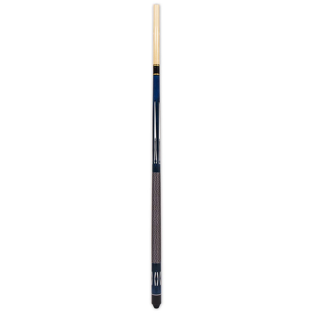 DESCRIPCIÓN:Taco de madera dura de 2 piezas de buena calidad. Diseño elegante en eje y trasero. Con punta de plástico atornillable (fácil de reemplazar), junta de latón con anillos implex, acabado en color azul y blanco. Con empuñadura de nylon negro con motas blancas.
