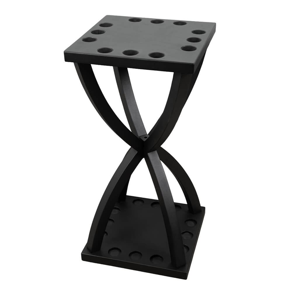 DESCRIPCIÓN:Este elegante taquero de metal negro con diseño de reloj de arena ofrece 12 compartimentos para sujetar los tacos de forma segura y evitar deformaciones. Su base estable en forma de X garantiza su robustez y se adapta a cualquier espacio. Un elemento moderno y funcional para los amantes del billar.