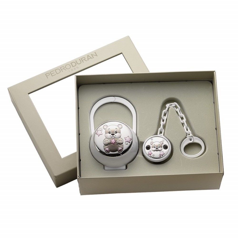 Set Osito con Estrellas rosa, Portachupetes + Pinza Chupete. Realizado por Pedro Duran en Plateado.