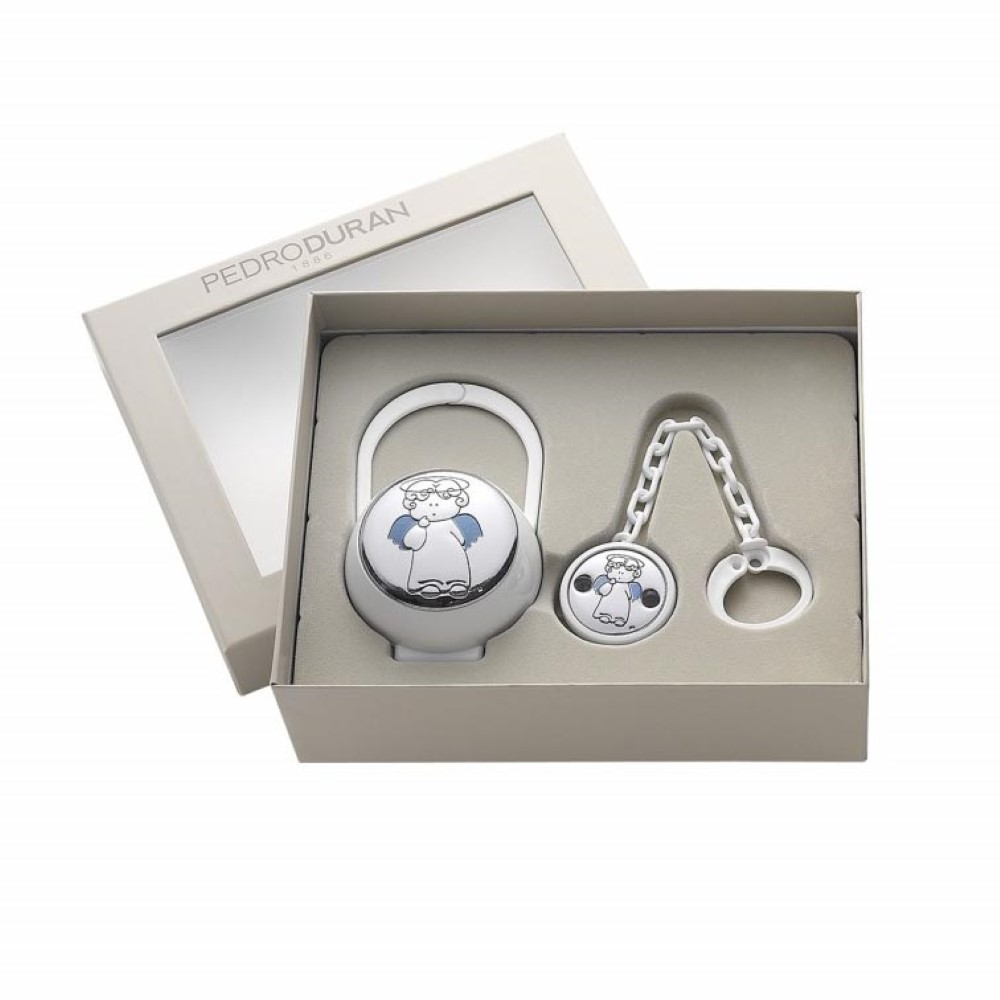 Set Querubín azul, porta chupetes + pinza . Realizada por Pedro Durán en plateado. Referencia: 07500428