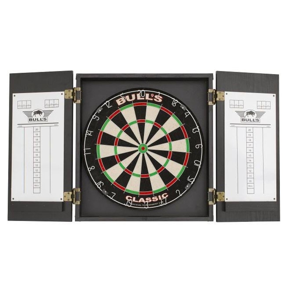 DESCRIPCIÓN:El Armario Bulls Beer and Darts Classic Cabinet Wood Black, está fabricado de madera de roble, lacado en negro con el dibujo de Cerveza y Dardos. Con un muy buen sistema de soporte para colgar su diana en la pared. Este sistema de soporte tiene 2 bloques donde encaja perfectamente la diana y se puede apretar con un tornillo. Cada armario Bulls Deluxe viene con 2 marcadores de pizarra. Este armario no incluye rotuladores ni borrador. Este armario también tiene un estante de madera debajo de los marcadores donde puede colocar su juego de dardos.