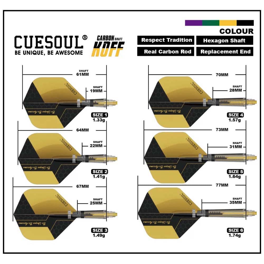 DESCRIPCIÓN:Sistema de caña y pluma Cuesoul Koff Carbon. Cañas de dardos CUESOUL KOFF de carbono con punta de repuesto y plumas de forma estándar grande.