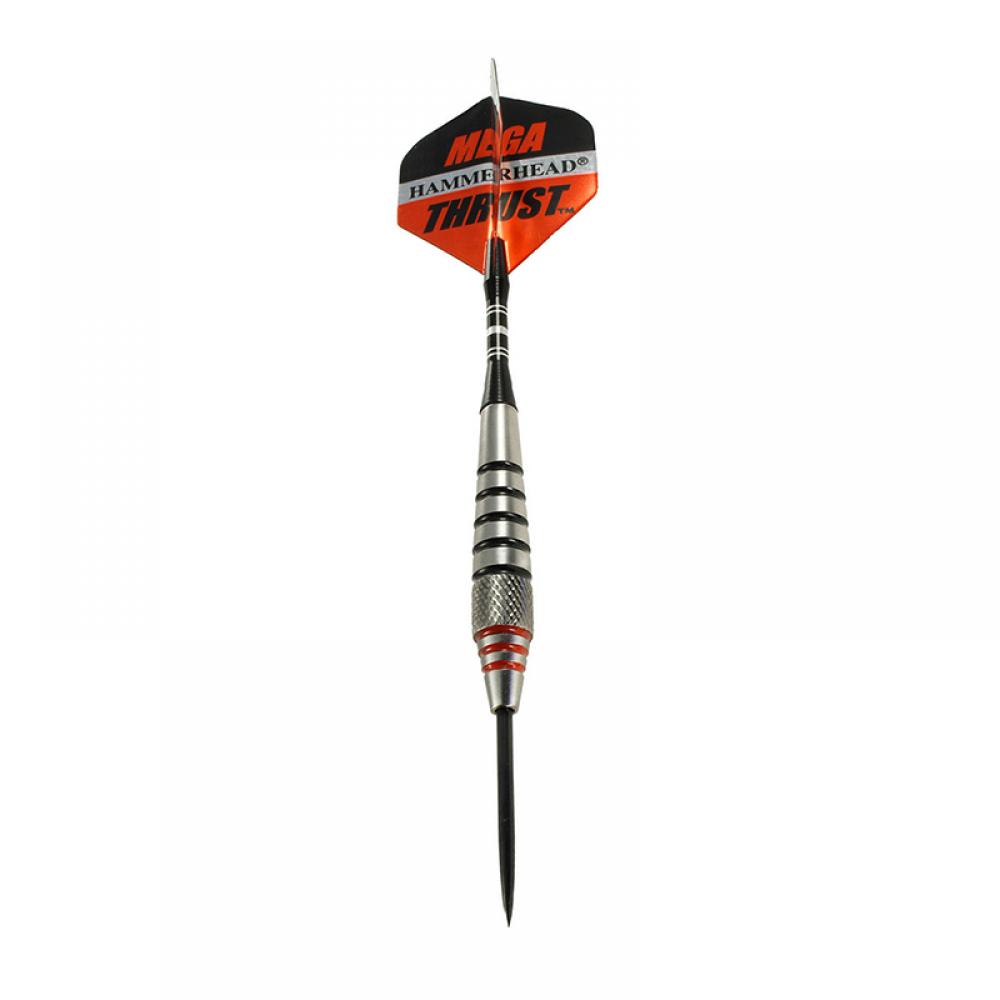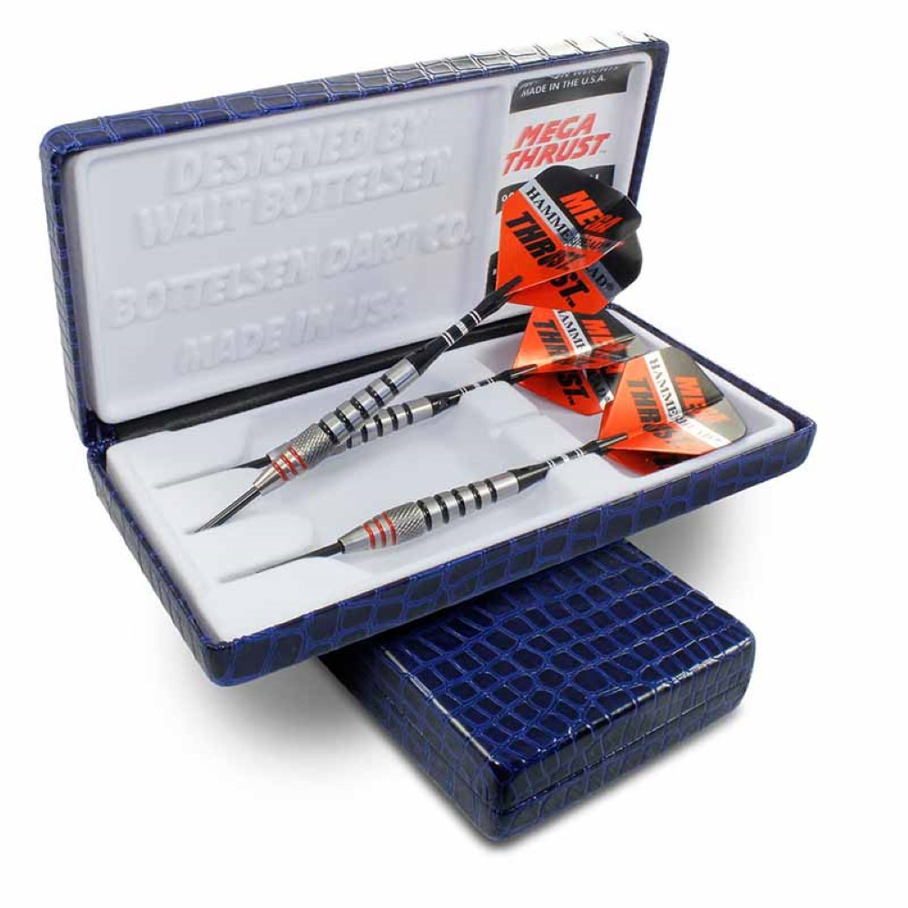 DESCRIPCIÓN:Dardos de gran calidad modelo Mega Thrust, fabricados en Estados Unidos por Bottelsen, dardos fabricado en tungsteno con acabado natural anillos en color negro y rojo con agarre un poco adelantado tipo snake.