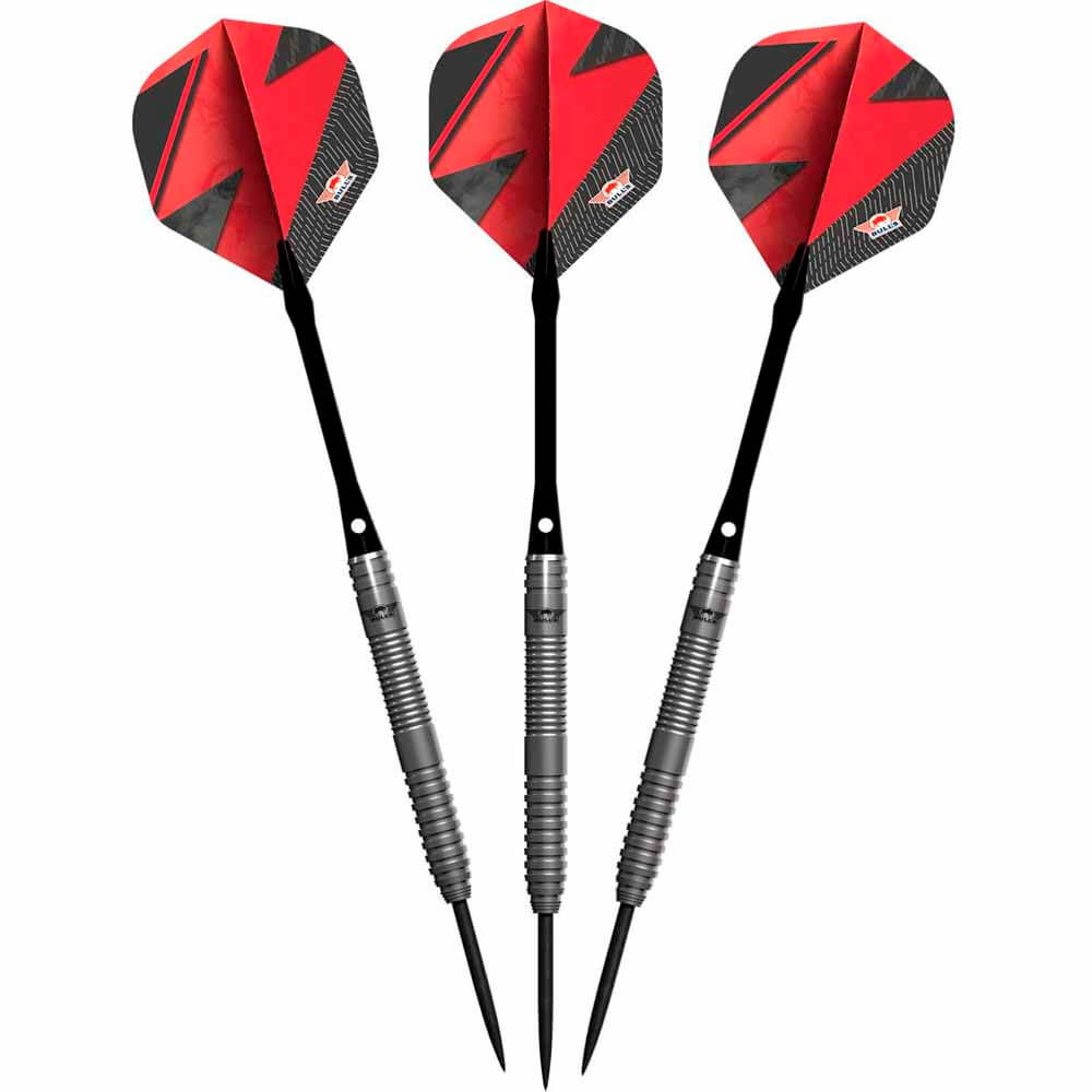 El juego de dardos se compone por 1 set de 3 cuerpos Lightning Red con punta de acero, 1 set de 3 cañas Nylon Medium Negro y 1 set de 3 plumas