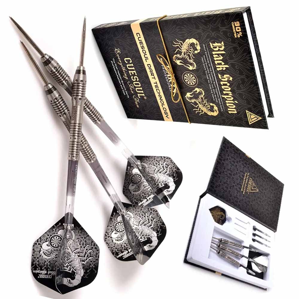 El juego de dardos Scorpion Black se compone por 1 set de 3 cuerpos Sky Wolf, 1 set de 3 cañas Cuesoul y 1 set de 3 plumas Cuesoul .