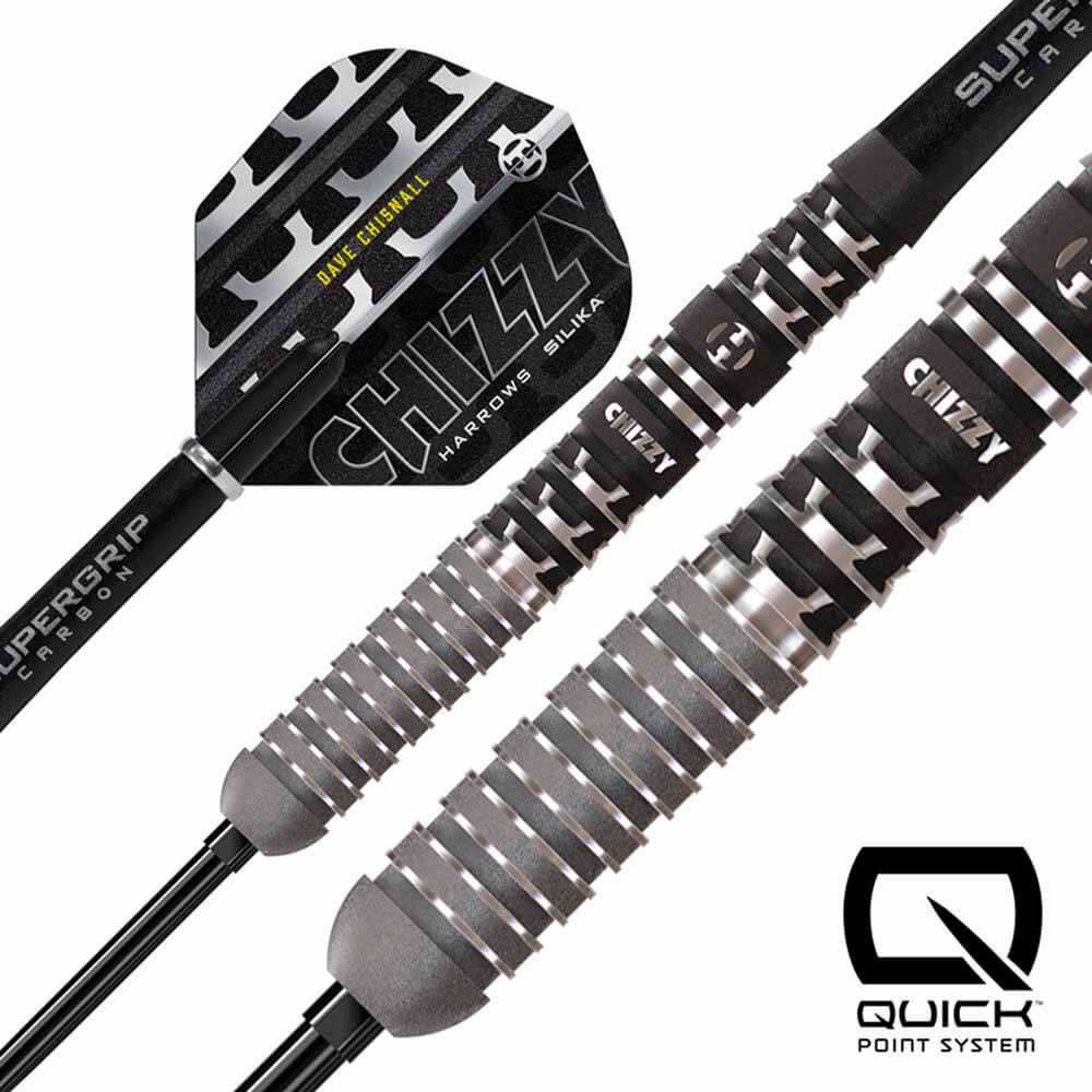 El juego de dardos se compone por 1 set de 3 cuerpos Harrows Darts Chizzy Dave Chisnall V4 , 1 set de 3 cañas Supergrip , 1 set de 3 plumas Chizzy , set de 3 puntas Quick y 1 llave Quick