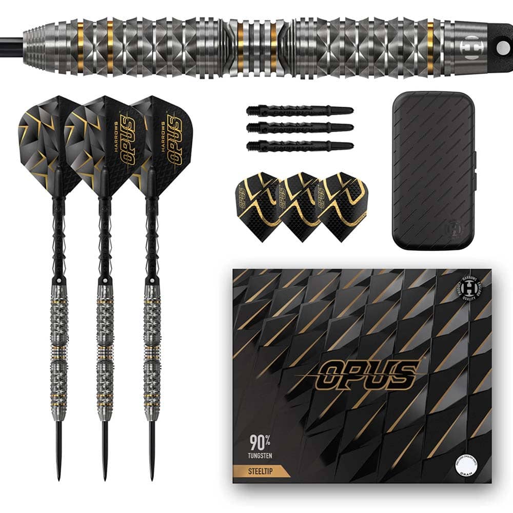Los dardos Opus se suministran con nuestro nuevo Slimcase, 2 juegos de varillas Carbon ST, 2 juegos de plumas Opus de 100 micrones y tienen un peso de competición de +/- 0,05 g.