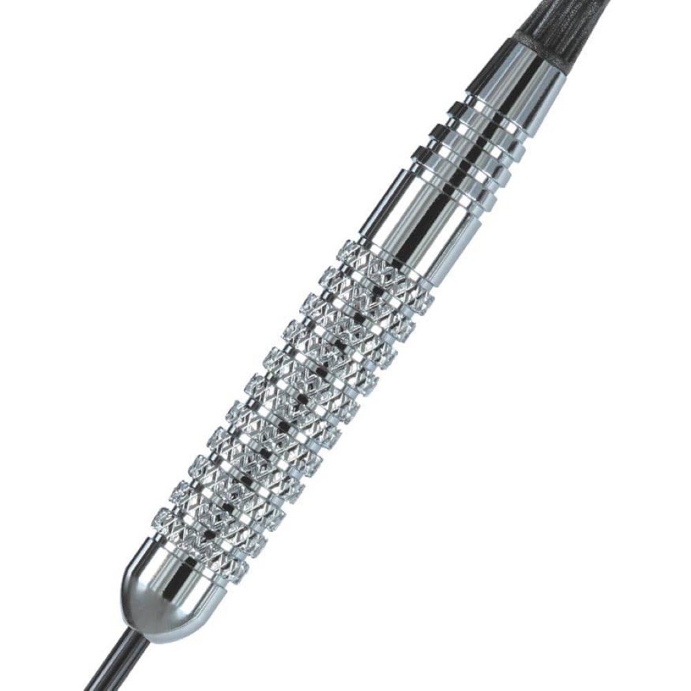 El juego de dardos se compone por 1 set de 3 cuerpos con punta de metal Harrows Darts Silver Arrows 24gk, 1 set de 3 cañas Alamo Medium 47mm negra y 1 set de 3 plumas Harrows Marathon