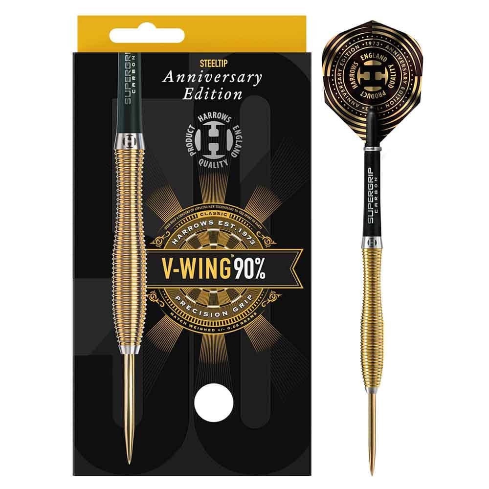Estos dardos están equipados con ejes Midi Supergrip Carbon y nuevas plumas Harrows Anniversary de 100 micrones.