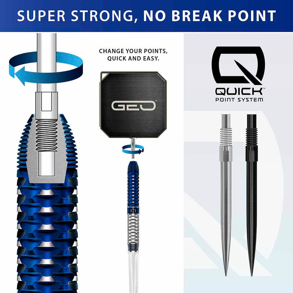 La innovación va más allá del cañón. Cada juego de dardos Geo incorpora la tecnología Quick Point, que permite a los jugadores personalizar la longitud de la punta en segundos y adaptar su configuración para una máxima confianza en el oche. Los dardos Geo también se combinan con nuestras nuevas plumas integradas Midi Solo, con tecnología Aero Core: una microtextura en la zona central de la pluma reduce la turbulencia y mejora la estabilidad, mientras que las suaves alas exteriores minimizan la resistencia para mantener la velocidad y una precisión milimétrica.