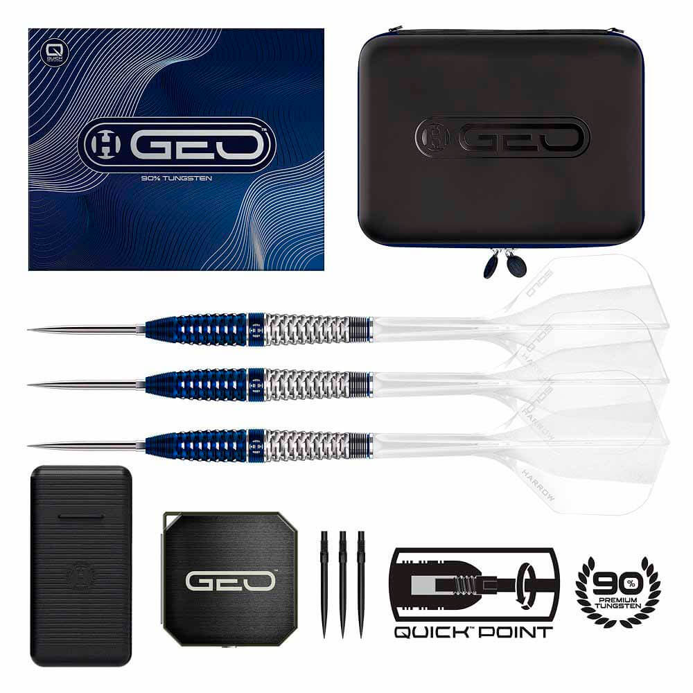El juego de dardos se compone por 1 set de 3 cuerpos Harrows Darts Geo , 1 set de 3 cañas Supergrip , 1 set de 3 plumas Impact, 2 juego de puntas Quick y 1 herramienta de punta rápida incluida con dardos con punta de acero