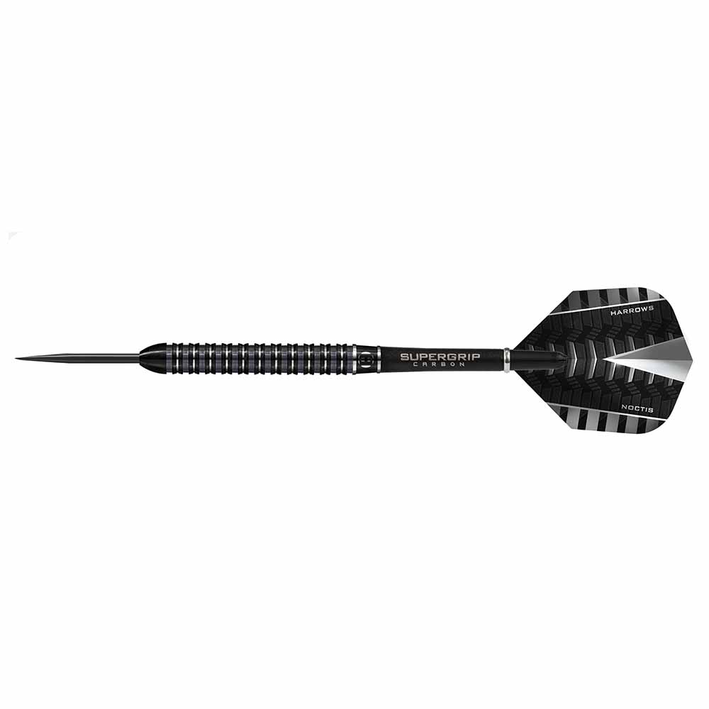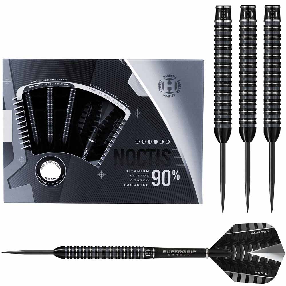 El dardos se compone por 1 set de dardos Noctis 24g de Harrows Darts, 1 set de 3 cañas Harrows Supergrip, 1 set de 3 plumas Noctis y 1 set de 3 puntas 2ba 4mm.