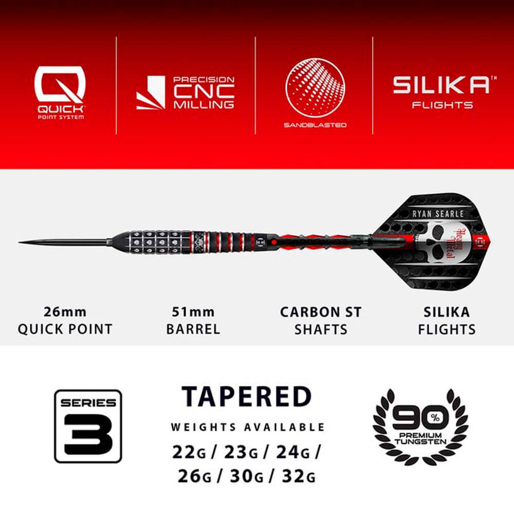 DESCRIPCIÓN:Dardos diseñado en estrecha colaboración con Ryan "Heavy Metal" Searle, el jugador sinónimo de los dardos más pesados en el circuito profesional, la Serie 3 ha sido elaborada meticulosamente para brindar la máxima confianza y precisión bajo presión, al tiempo que captura la personalidad audaz de uno de los jugadores más reconocibles del juego.
