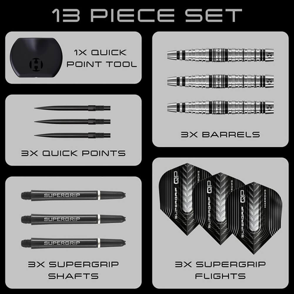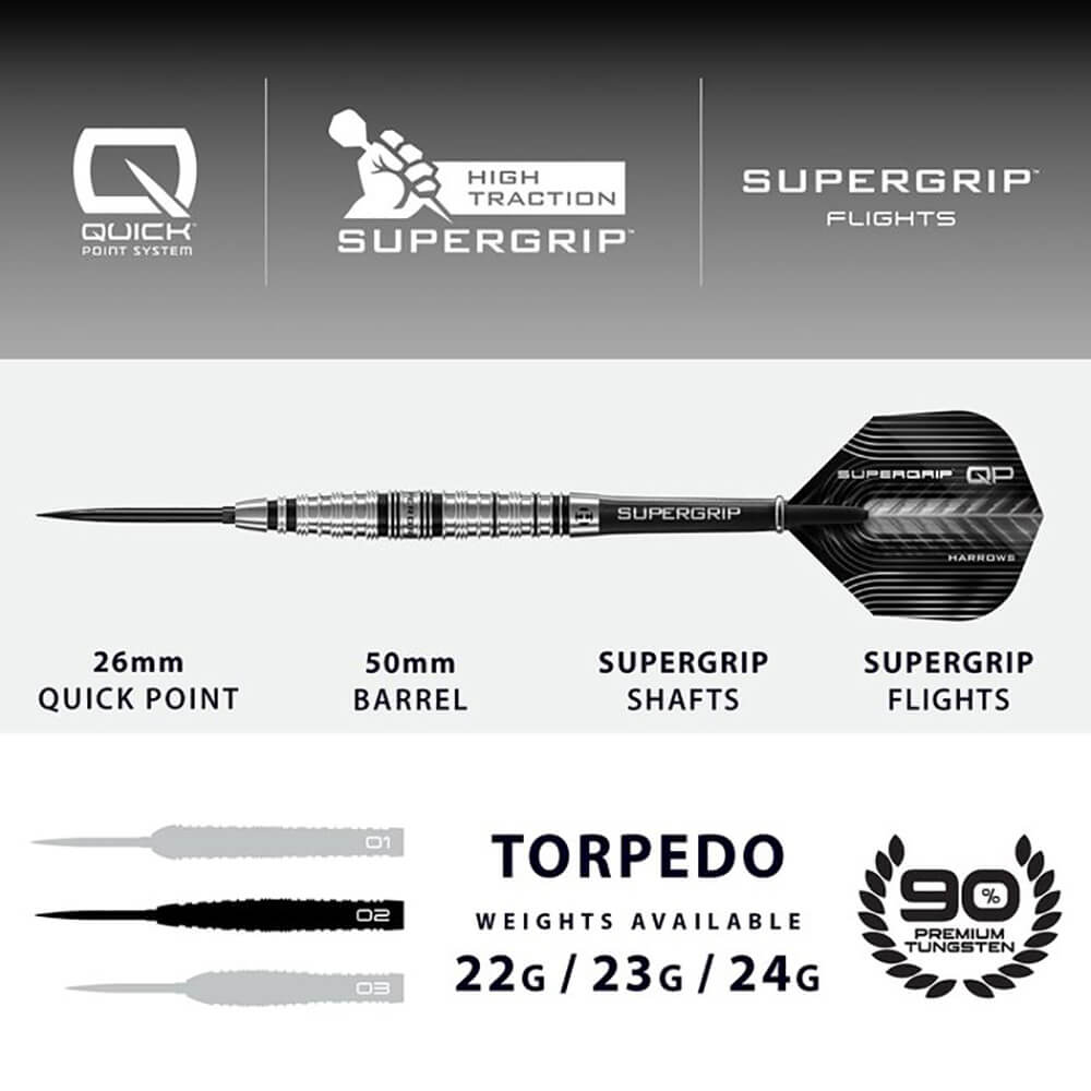 El dardos se compone por 1 set de 3 cuerpos Harrows Darts Supergrip Torpedo Quick Point, 1 set de 3 cañas Harrows Supergrip Negro y 1 set de 3 plumas Supergrip Torpedo Quick Point original Harrows Darts