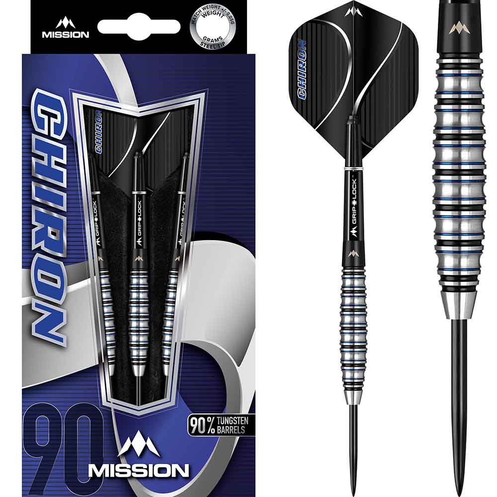 DESCRIPCIÓN:Dardos de tungsteno con punta de acero Mission Chiron - 90% tungsteno. Características: 90 % barriles de tungsteno, colores eléctricos: 1 juego de plumas de misión, 1 juego de ejes de misión con anillos S-Lock, protector de puntas. Dardos Mission Chiron - Punta de acero - M2 - Electro Black & Blue