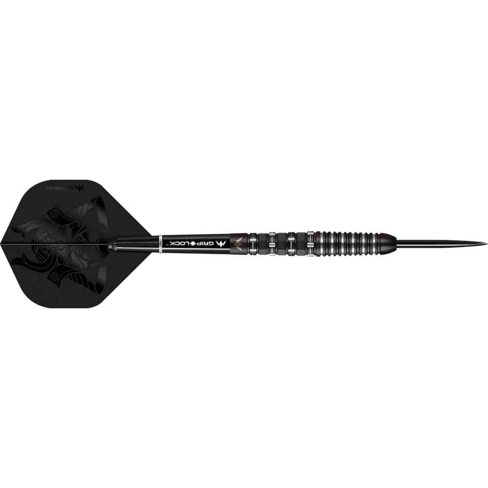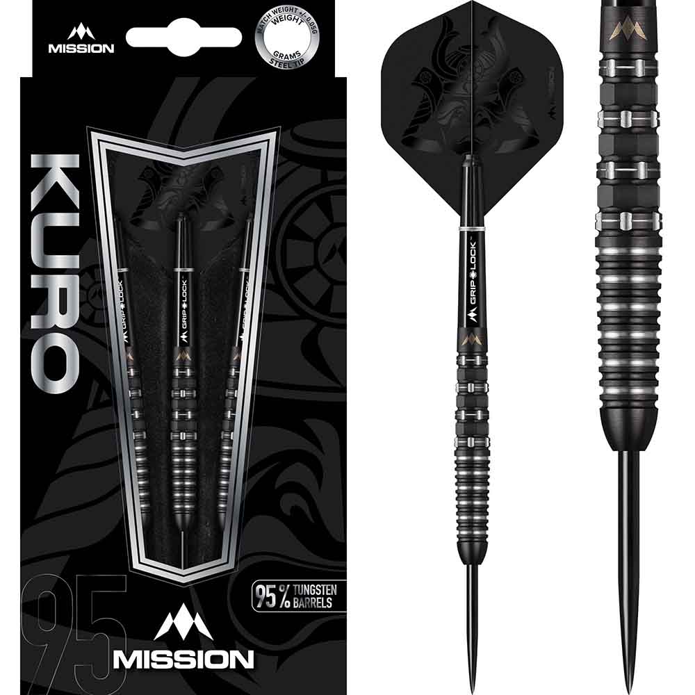 DESCRIPCIÓN:Dardos de tungsteno con punta de acero Mission Kuro M3 - 95% tungsteno. Características: 95 % barriles de tungsteno, 1 juego de plumas de misión, 1 juego de ejes de misión con anillos S-Lock, protector de puntos. Dardos Mission Kuro - Punta de acero - Negro - M3 - Iso-Grip trasero