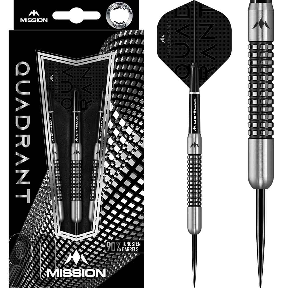 DESCRIPCIÓN:Dardos de tungsteno con punta de acero Mission Quadrant - 90% tungsteno. Características: 90 % barriles de tungsteno con empuñadura cuádruple, 1 juego de plumas de misión, 1 juego de ejes de misión con anillos S-Lock, protector de puntos.