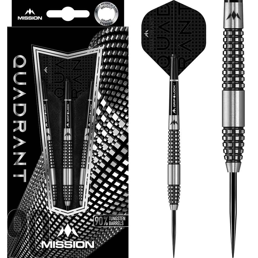 DESCRIPCIÓN:Dardos de tungsteno con punta de acero Mission Quadrant - 90% tungsteno. Características: 90 % barriles de tungsteno con empuñadura cuádruple, 1 juego de plumas de misión, 1 juego de ejes de misión con anillos S-Lock, protector de puntos.