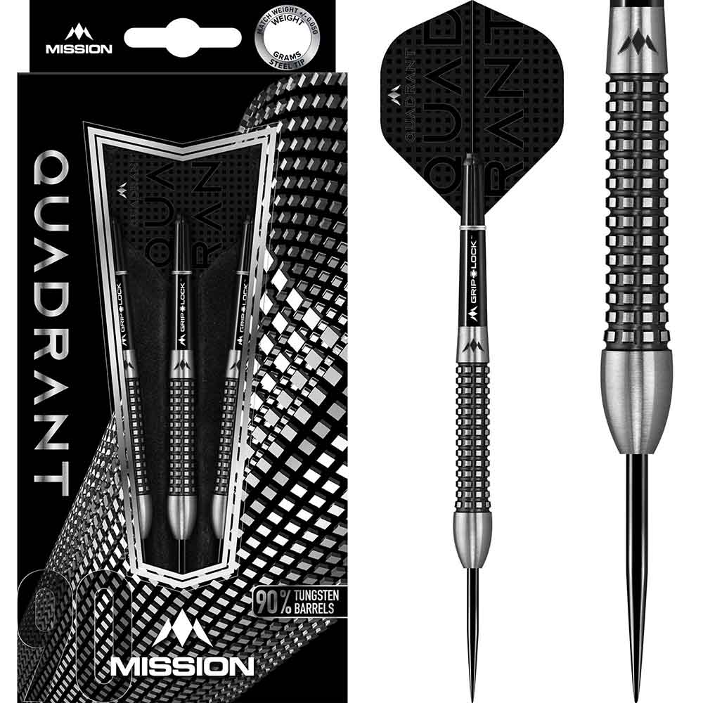 DESCRIPCIÓN:Dardos de tungsteno con punta de acero Mission Quadrant - 90% tungsteno. Características: 90 % barriles de tungsteno con empuñadura cuádruple, 1 juego de plumas de misión, 1 juego de ejes de misión con anillos S-Lock, protector de puntos.