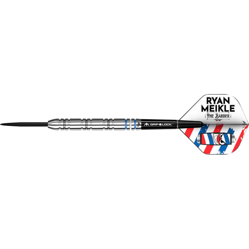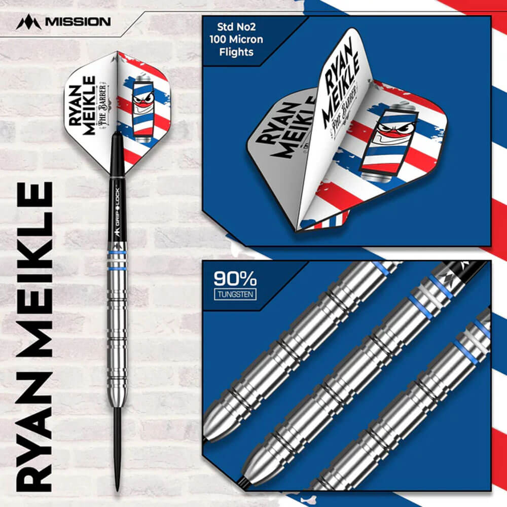 DESCRIPCIÓN:'The Barber' lleva 10 años consecutivos con una tarjeta del circuito PDC y se ha consolidado como un profesional en el mundo de los dardos. El primer set de dardos exclusivos de Meikle para Mission está fabricado con un 90 % de tungsteno. Este dardo de barril recto cuenta con tres secciones de agarre con ranuras cuadradas, separadas por secciones de tungsteno liso, con una punta redondeada lisa que termina en una punta negra lisa. La parte trasera del dardo incluye anillos pintados en azul y blanco, en homenaje al Ipswich Town, el club de fútbol favorito de Meikle, que desemboca en una pequeña sección lisa con el logotipo de Mission grabado con láser. Los dardos Mission de Meikle incluyen ejes blancos Mission Grip Lock y las plumas exclusivas del jugador.