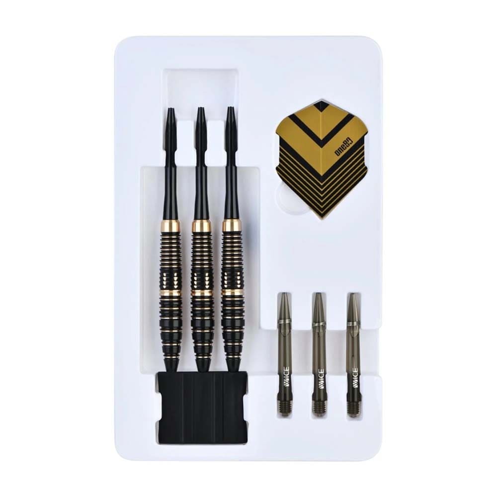 El producto se compone por 1 set de 3 cuerpos dardos One 80 Mobilizer , 1 set de 3 cañas One 80 Darts y 1 set de 3 plumas One 80 Darts