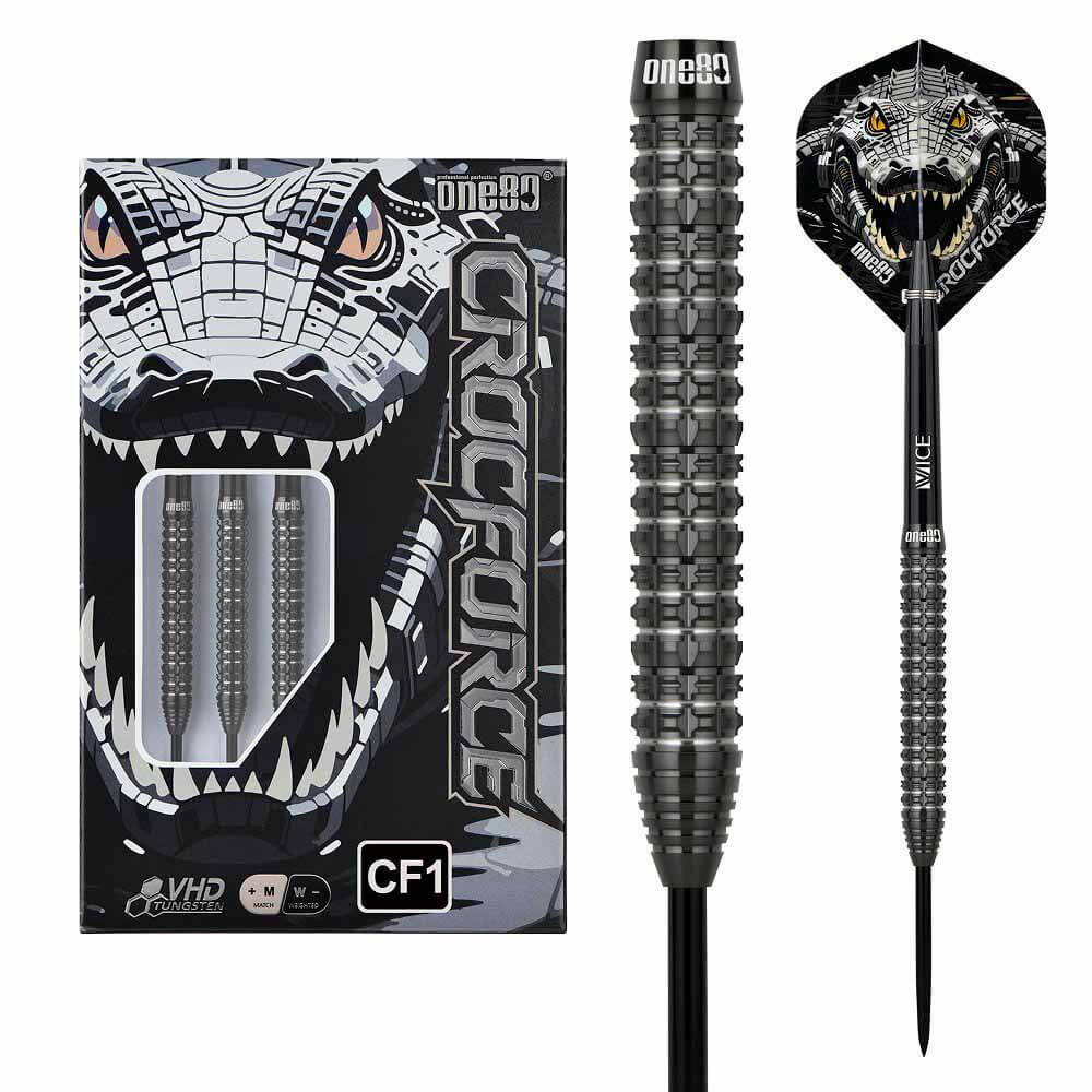 DESCRIPCIÓN:Dardos fabricados por One 80 modelo Crocforce CF1 , dardos de gran calidad con un excelente agarre todo ello acabado en color negro con detalles en los anillos plateados.
