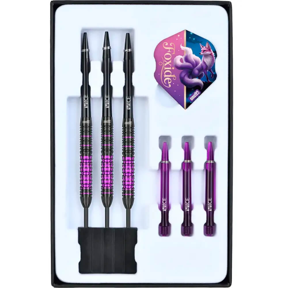 DESCRIPCIÓN:Los dardos ONE80 Foxide F1 90% son la opción ideal para jugadores ambiciosos que valoran la calidad y la precisión. Con un 90% de tungsteno, estos dardos ofrecen máxima durabilidad y un diseño elegante y profesional. Su llamativo acabado en negro y morado garantiza visibilidad y estilo en la diana. El diseño de barril recto combina zonas de agarre fresadas y anilladas para una sujeción óptima sin una textura de superficie agresiva.