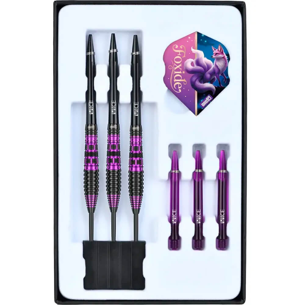 DESCRIPCIÓN:Los dardos ONE80 Foxide F2 90% son la opción ideal para jugadores ambiciosos que valoran la calidad y la precisión. Con un 90% de tungsteno, estos dardos ofrecen máxima durabilidad y un diseño elegante y profesional. Su llamativo acabado en negro y morado garantiza visibilidad y estilo en la diana. El diseño de barril con la punta más ovalada combina zonas de agarre fresadas y anilladas para una sujeción óptima sin una textura de superficie agresiva.