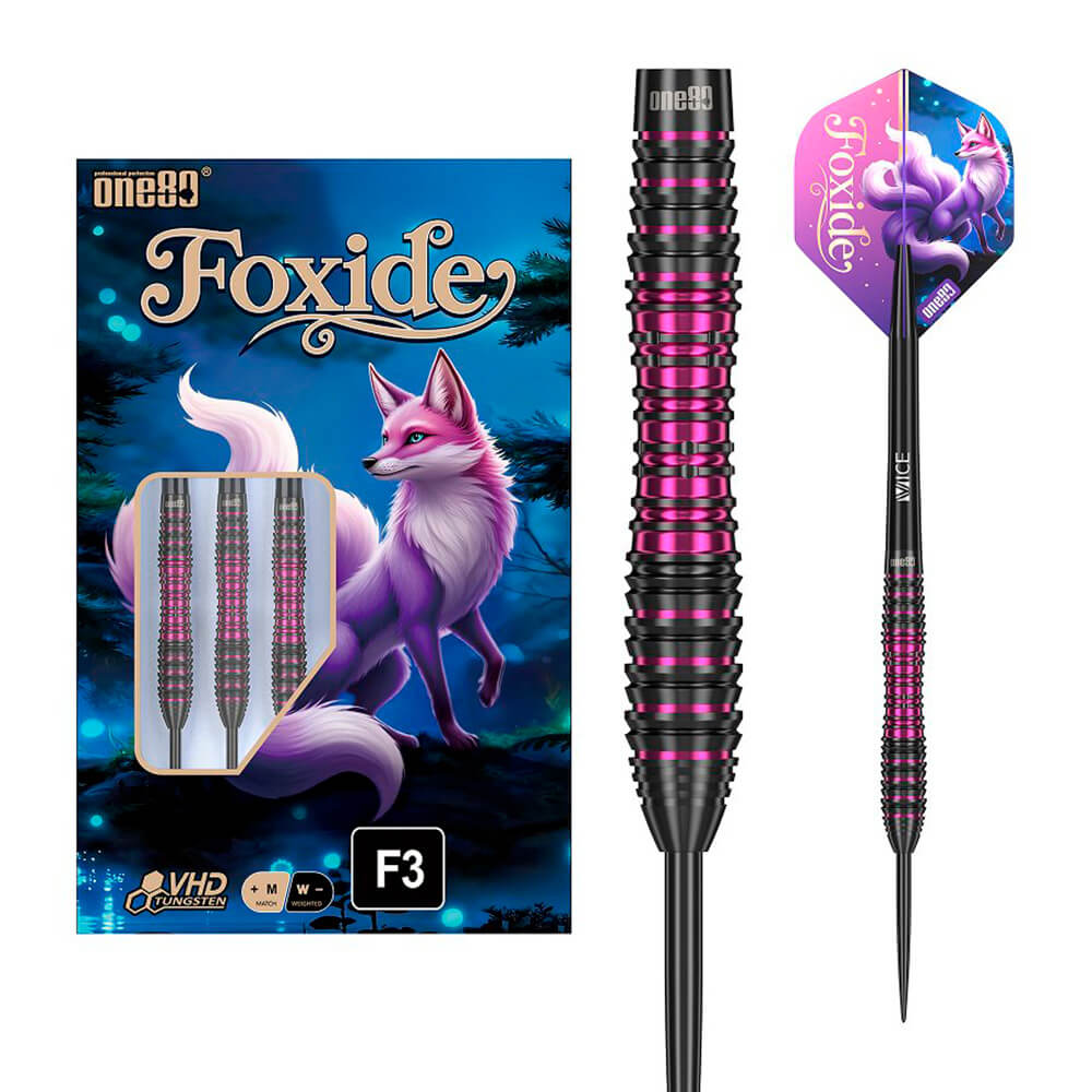 DESCRIPCIÓN:Los dardos ONE80 Foxide F3 90% son la opción ideal para jugadores ambiciosos que valoran la calidad y la precisión. Con un 90% de tungsteno, estos dardos ofrecen máxima durabilidad y un diseño elegante y profesional. Su llamativo acabado en negro y morado garantiza visibilidad y estilo en la diana. La combinación de agarre anillado y agarre de tiburón garantiza una sujeción segura y un control óptimo en cada lanzamiento.