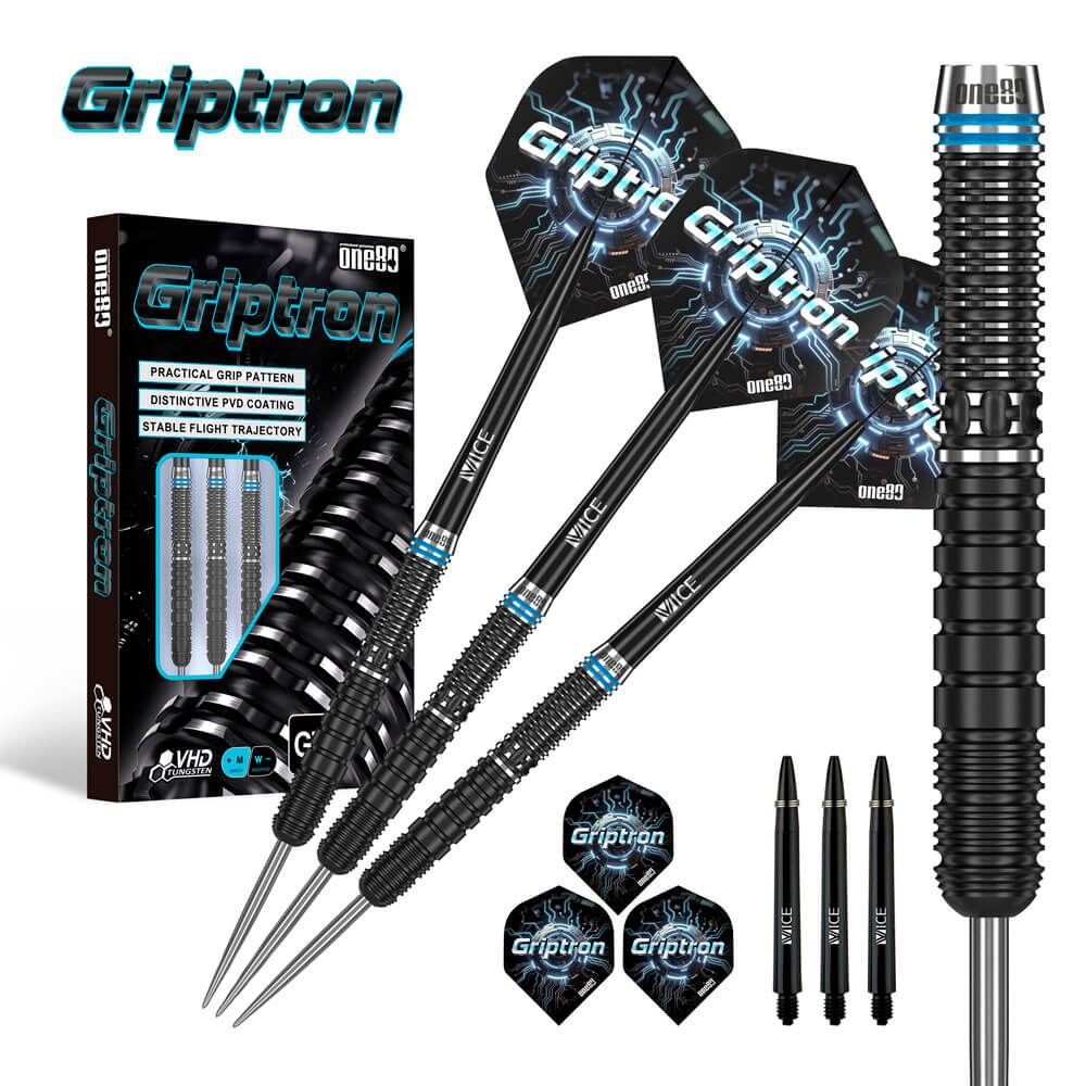 DESCRIPCIÓN:Los dardos ONE80 Griptron GT4 90% son la opción ideal para jugadores ambiciosos que valoran la calidad y la precisión. Con un 90% de tungsteno, estos dardos ofrecen máxima durabilidad y un diseño elegante y profesional. Sus anillos y fresados lacados en negro le confieren un aspecto elegante, convirtiéndolos en la mejor opción entre los dardos de punta de plástico.