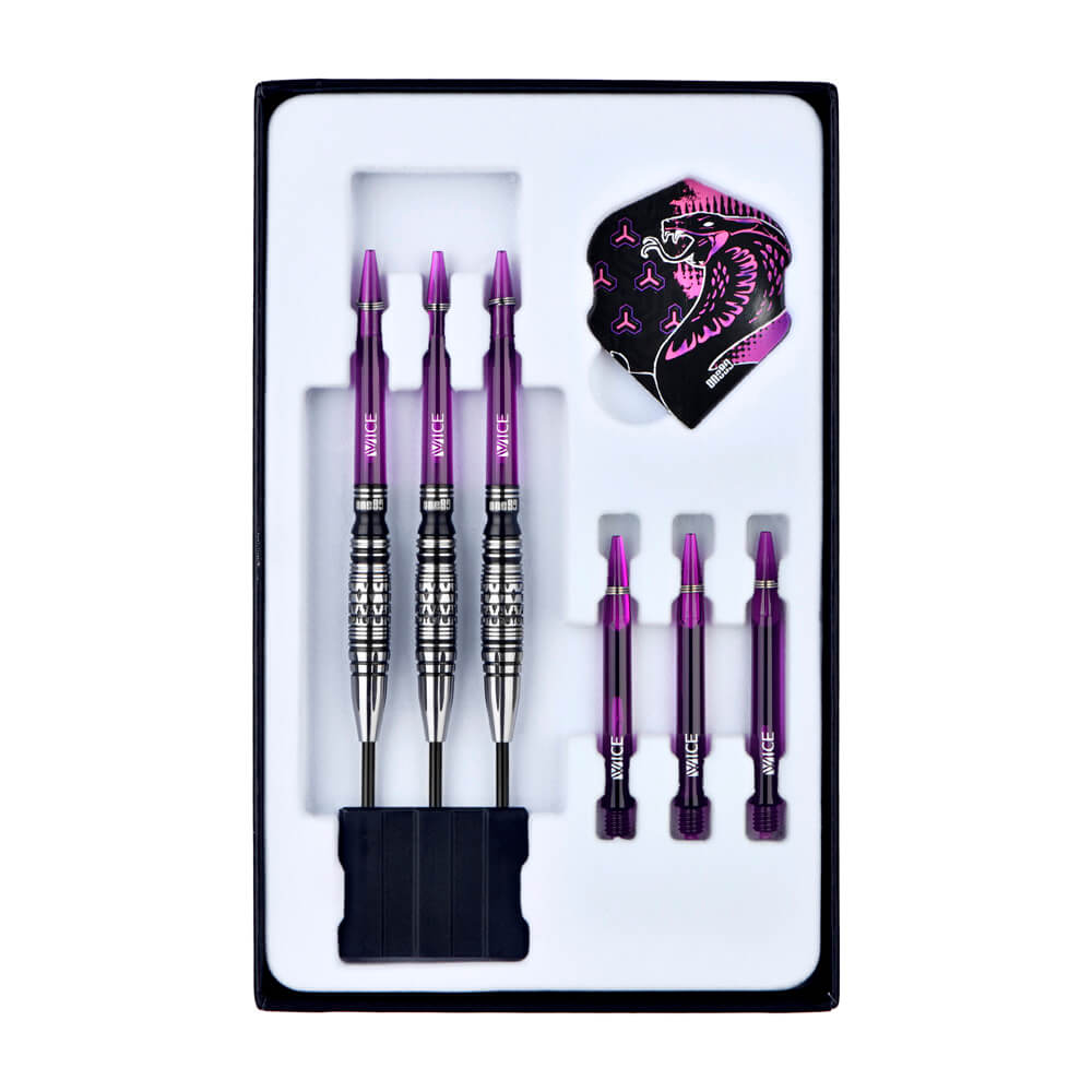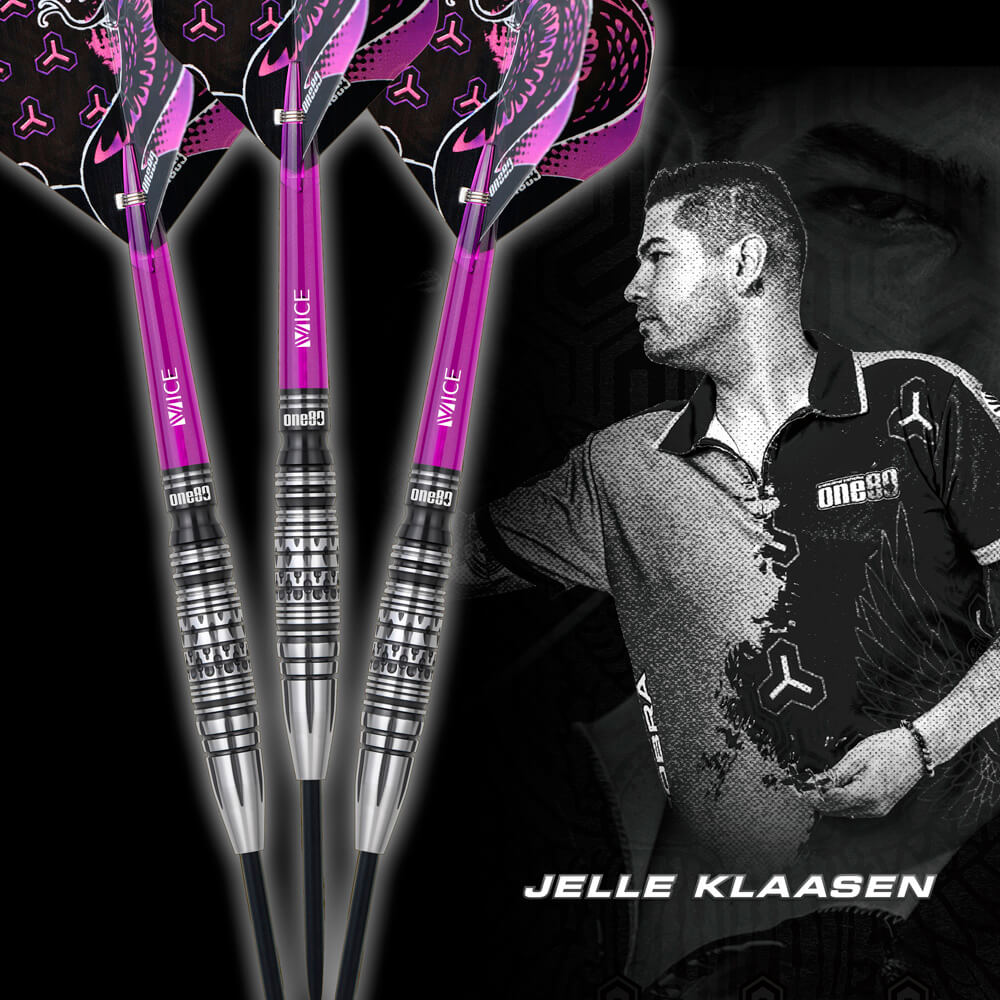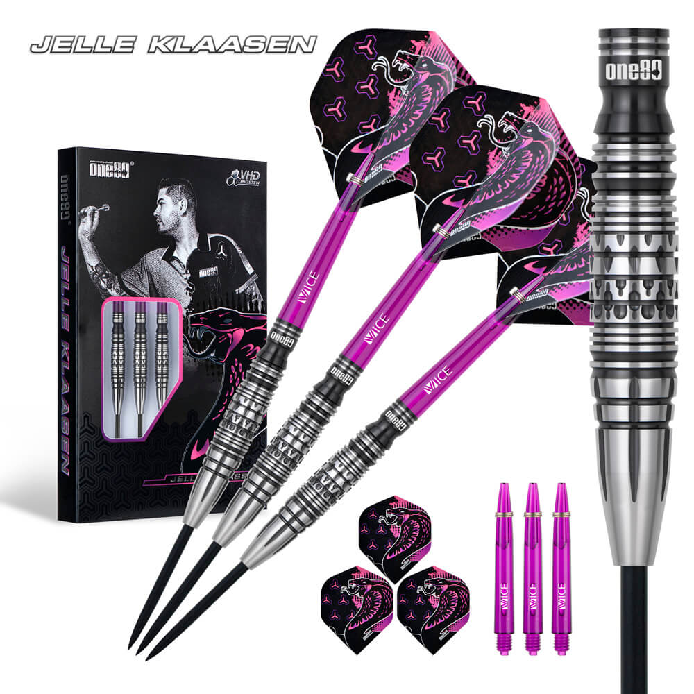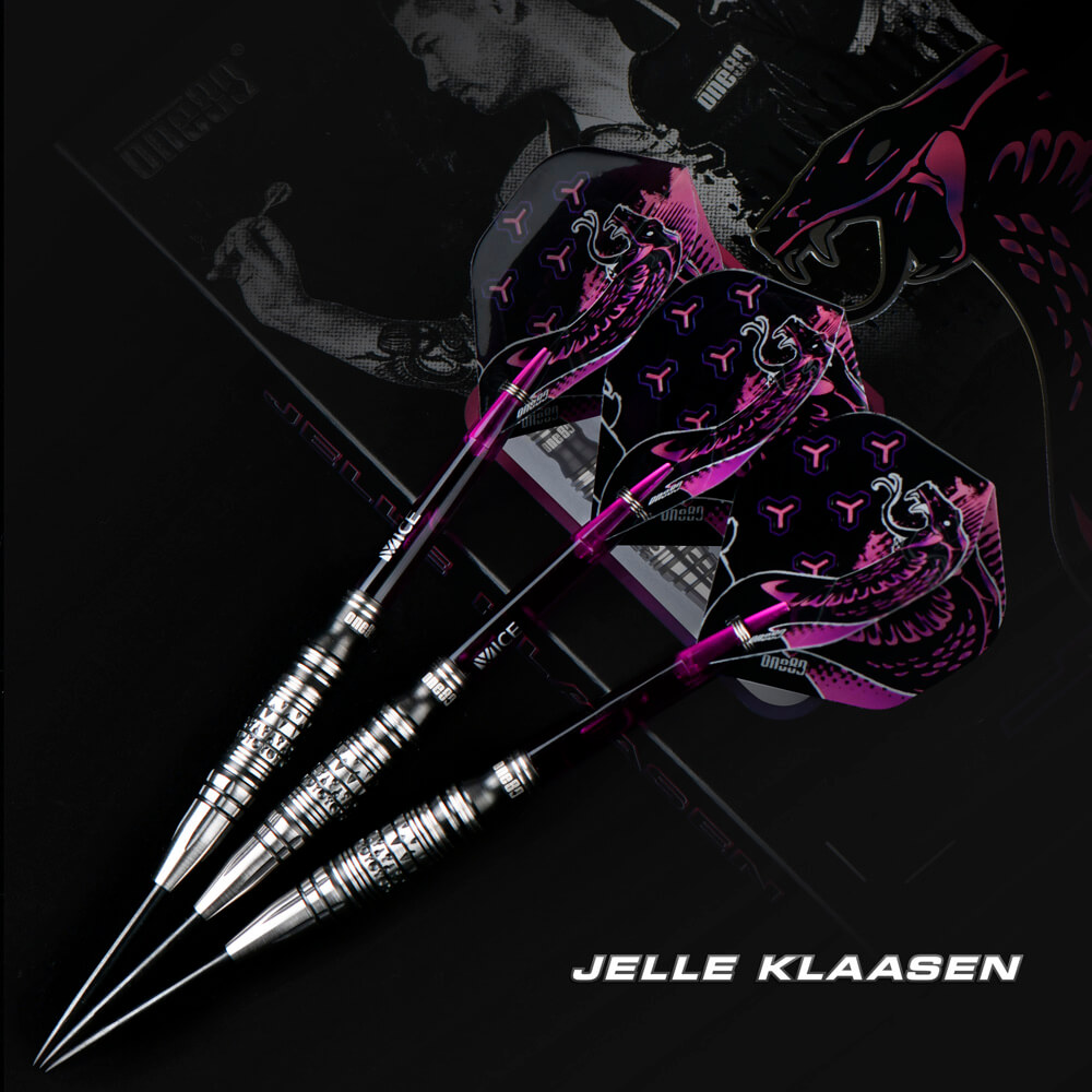 El juego de dardos Jelle Klaasen V3 se compone por 1 set de 3 cuerpos, 1 set de 3 cañas y 1 set de 3 plumas