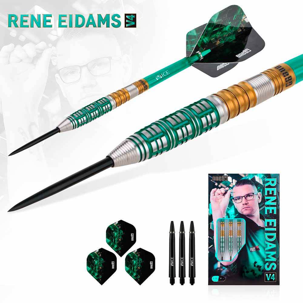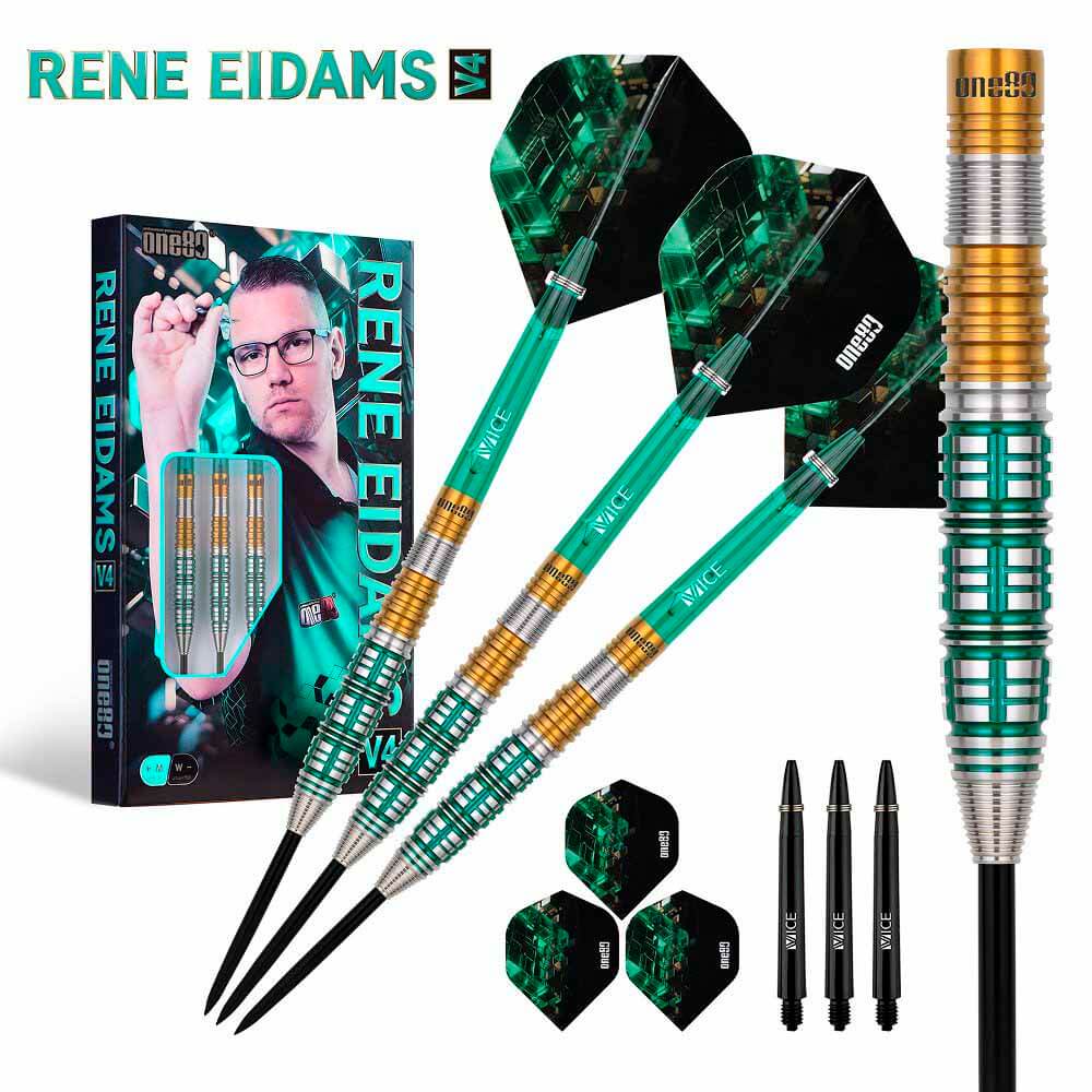 DESCRIPCIÓN:El juego de dardos Rene Eidams  a sido fabricado por la Marca One 80 y diseñado por el jugador Rene Eidams ahroa en su version 4 .
