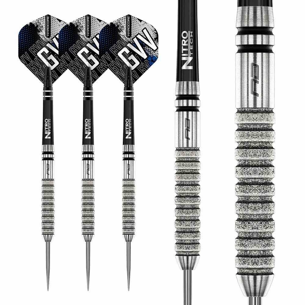 El juego de dardos e compone por 1 set de 3 cuerpos Gian van Veen Tour Edition, 1 set de 3 cañas y 1 set de 3 plumas Red Dragon