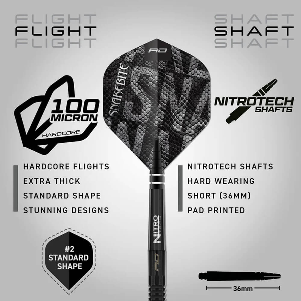 El juego de dardos se compone por 1 set de 3 cuerpos Peter Wright Black Mamba con punta de acero, 1 set de 3 cañas Red Dragon y 1 set de 3 plumas Red Dragon Hardcore.