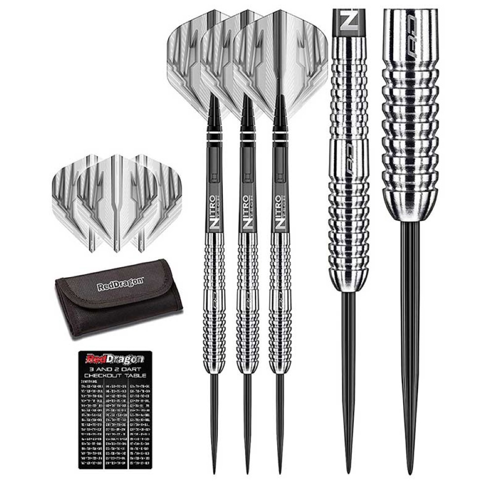El juego de dardos e compone por 1 set de 3 cuerpos Velociti Red Dragon, 1 set de 3 cañas y 2 set de 3 plumas Red Dragon.