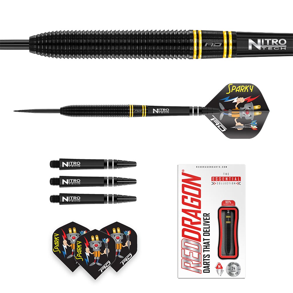 El juego de dardos e compone por 1 set de 3 cuerpos Wess Harms Red Dragon, 1 set de 3 cañas y 1 set de 3 plumas Red Dragon.