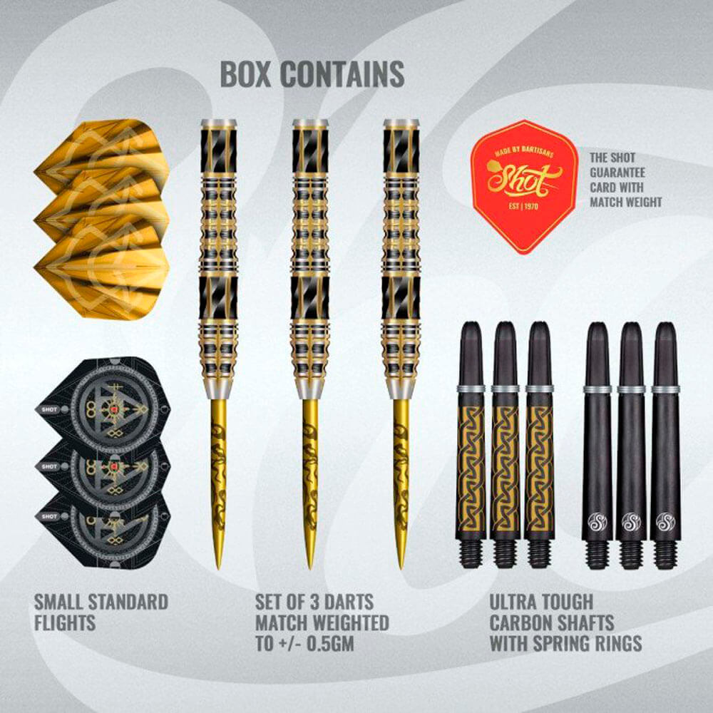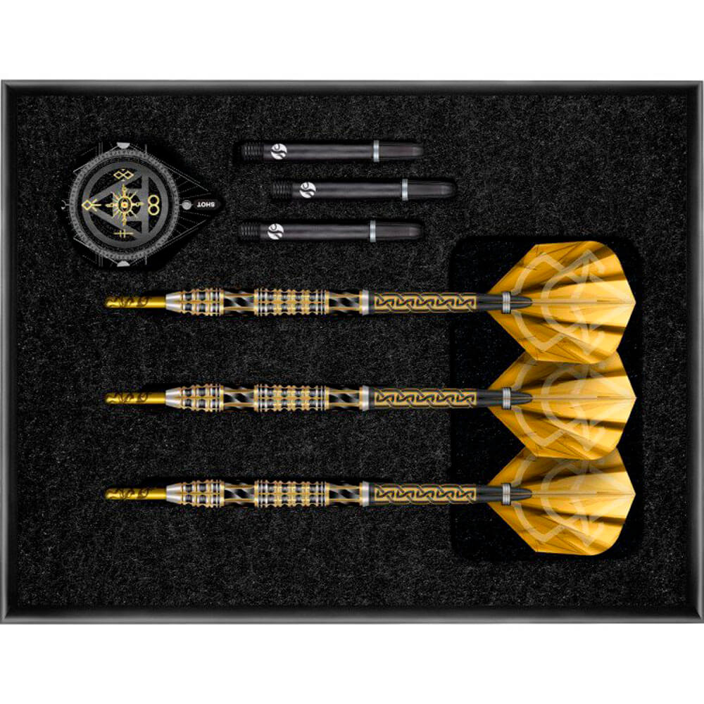 El dardos se compone por 1 ser de 3 cuerpos Alchemy Auro con punta de acero, 1 ser de 3 cañas Shot y 1 set de 3 plumas Shot.