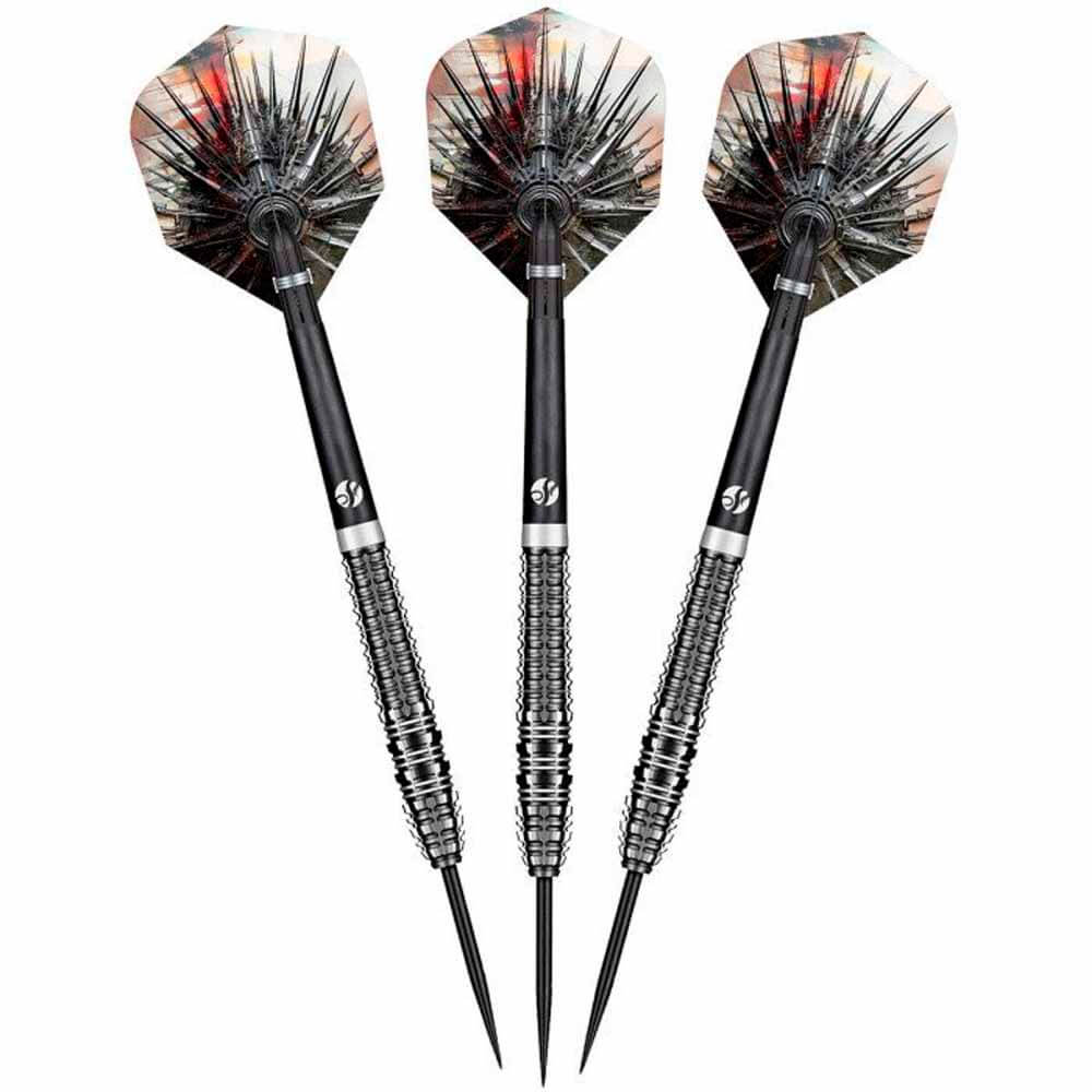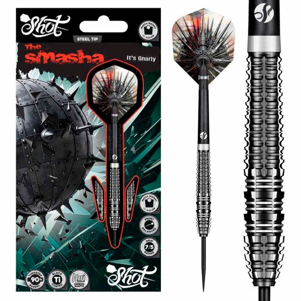 El dardos se compone por 1 ser de 3 cuerpos Gnarly Smasha con punta de acero, 1 ser de 3 cañas Shot y 1 set de 3 plumas Shot.
