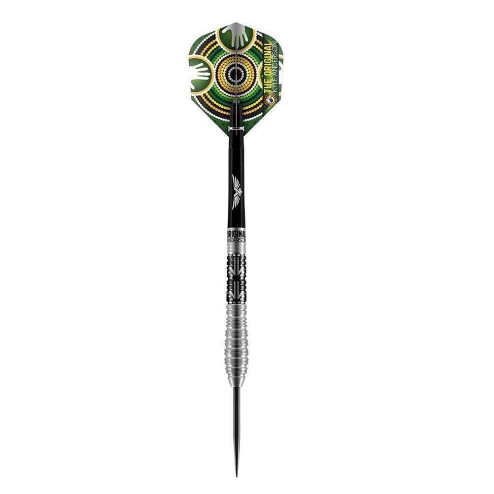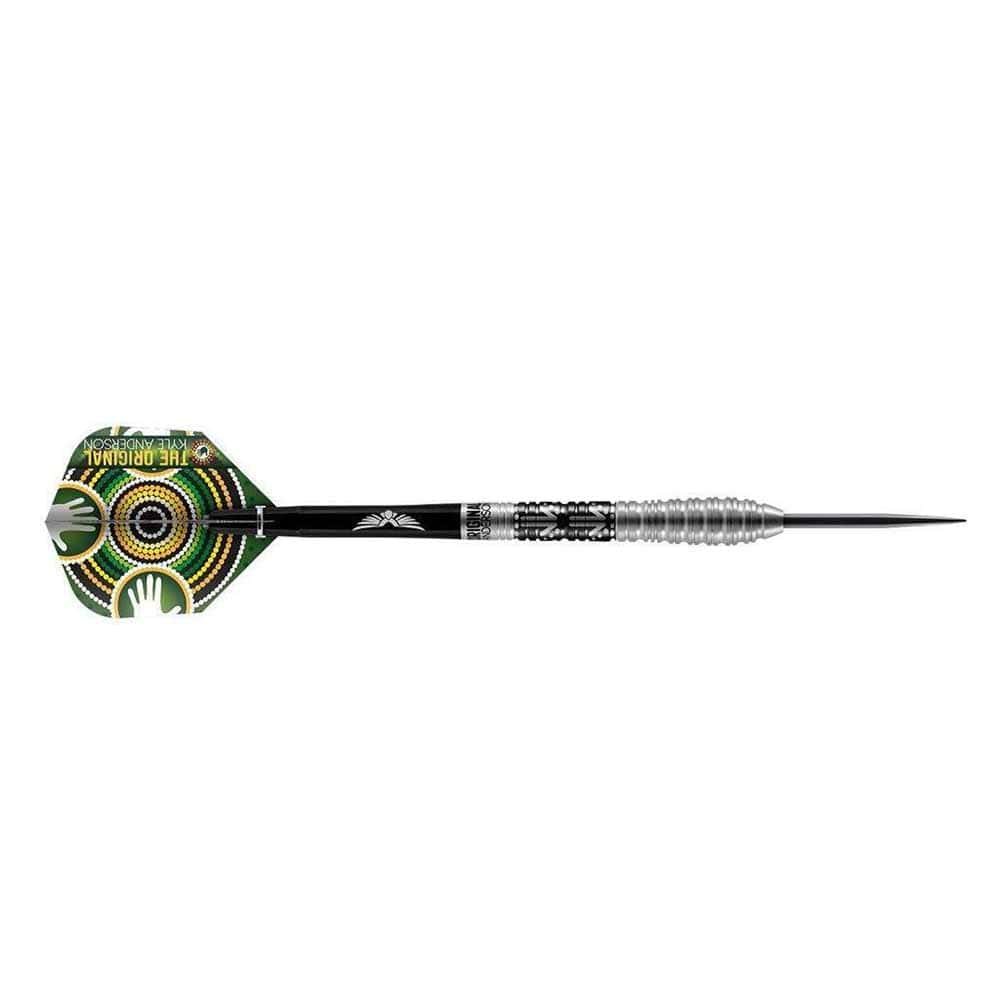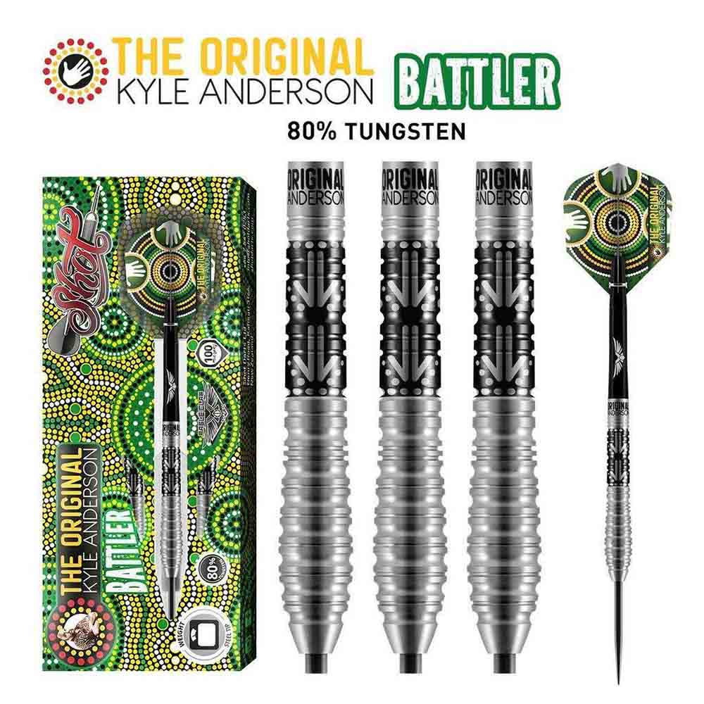 El dardos se compone por 1 set de 3 cuerpos Shot Kyle Anderson Battler 80% 24gm , 1 set de 3 cañas y 1 set de 3 plumas .