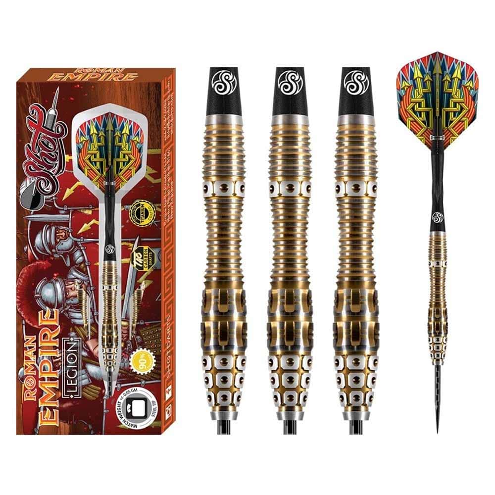 El dardos se compone por 1 ser de 3 cuerpos Roman Empire Legion con punta de metal, 1 ser de 3 cañas y 1 set de 3 plumas.