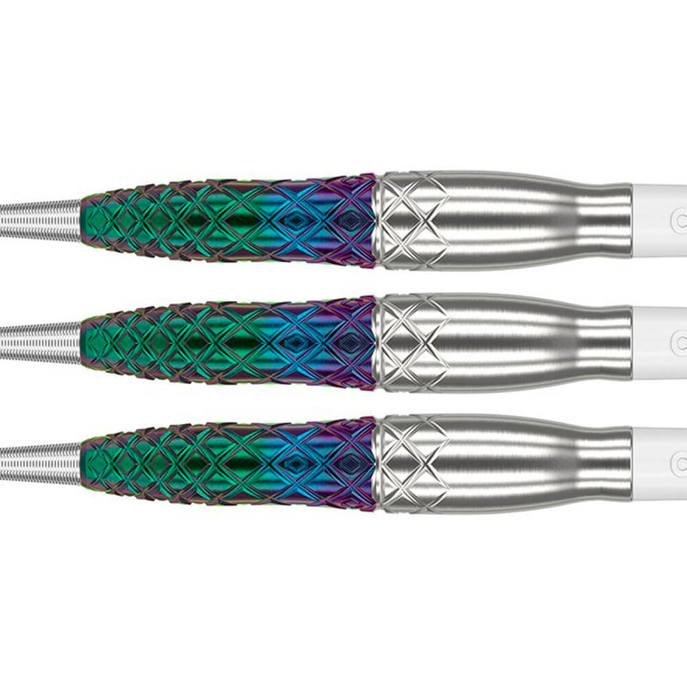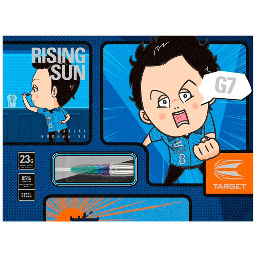 DESCRIPCIÓN:Haruki Muramatsu es un jugador de dardos japonés. Su modelo G7 llama la atención a primera vista por su forma de barril poco convencional y su revestimiento mate multicolor. La parte frontal, más estrecha, presenta delicados cortes a cuadros, mientras que la parte trasera, más ancha, es mayormente lisa.