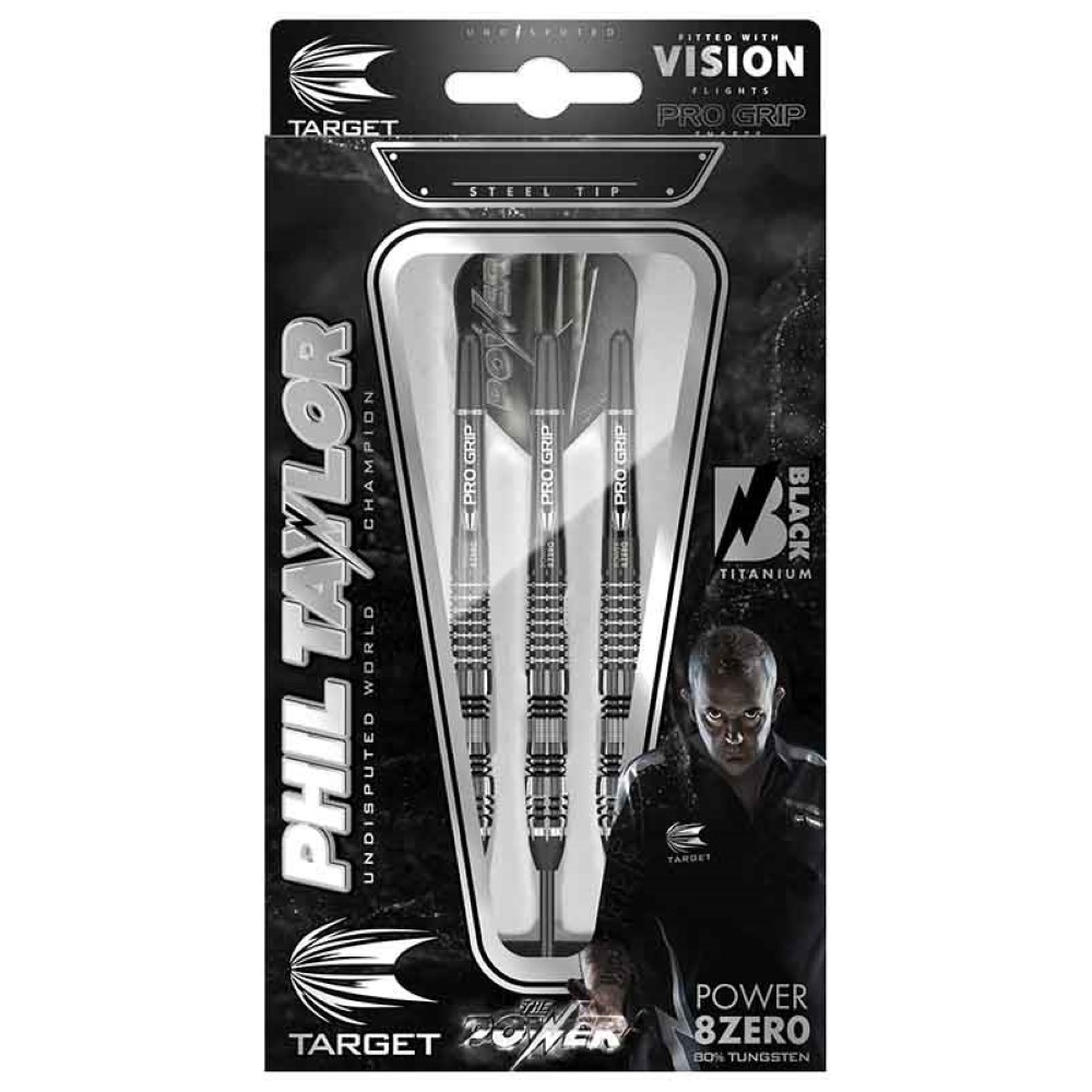 El juego de dardos se compone por 1 set de 3 cuerpos Phil Taylor Power 8Zero 4 Black, 1 set de 3 cañas Pro Grip y 1 set de plumas Target The Power Phil Taylor.