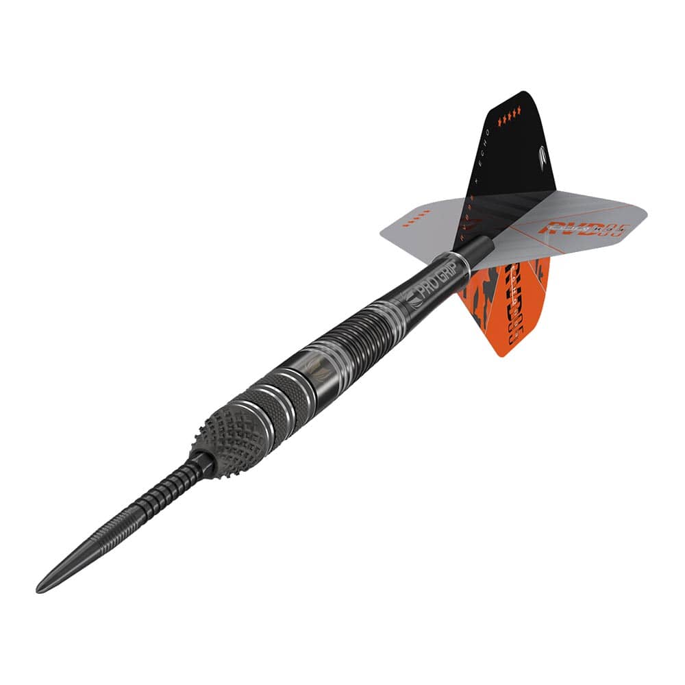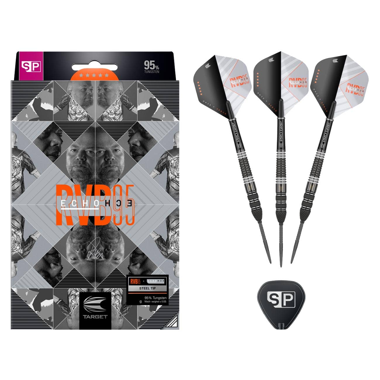 El juego se compone por 1 set de 3 cuerpos de dardos RVB X Echo SP, 1 set de 3 cañas Pro Grip negras cortas, 1 set de 3 plumas RVBxEcho Shape y 1 herramienta Swiss Point Tool que te permite cambiar las puntas más fácilmente.