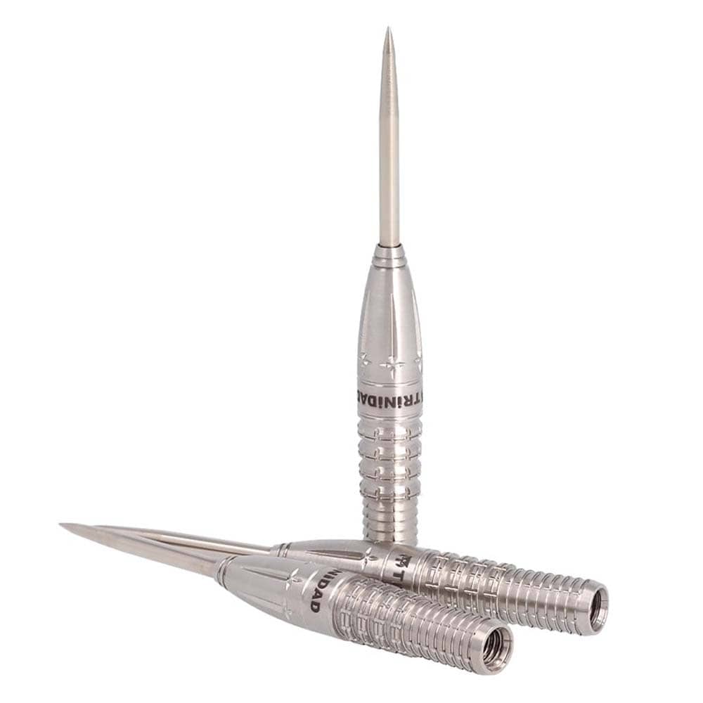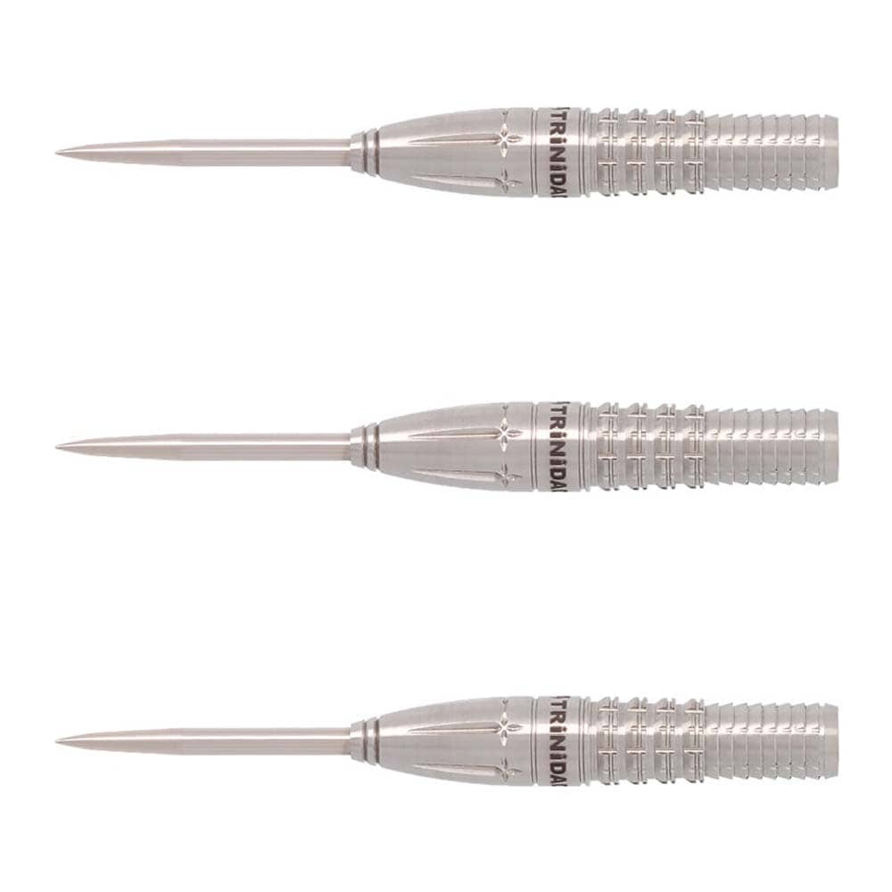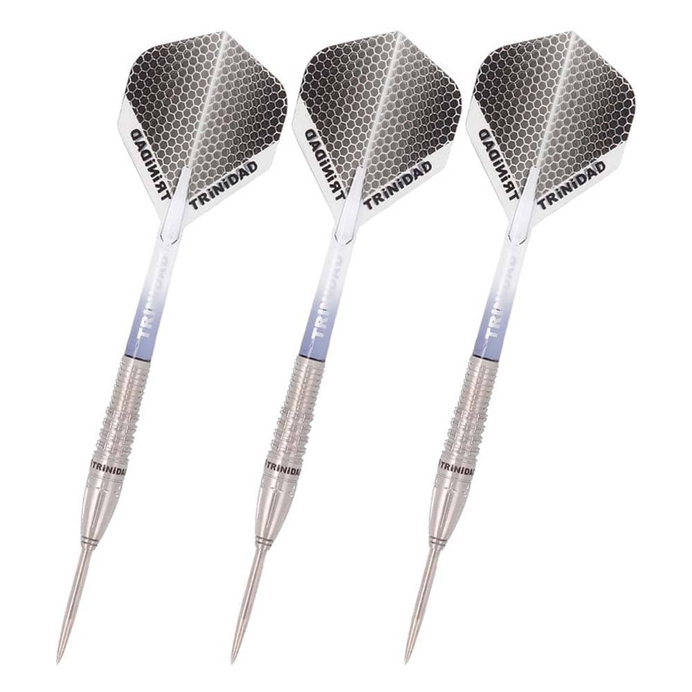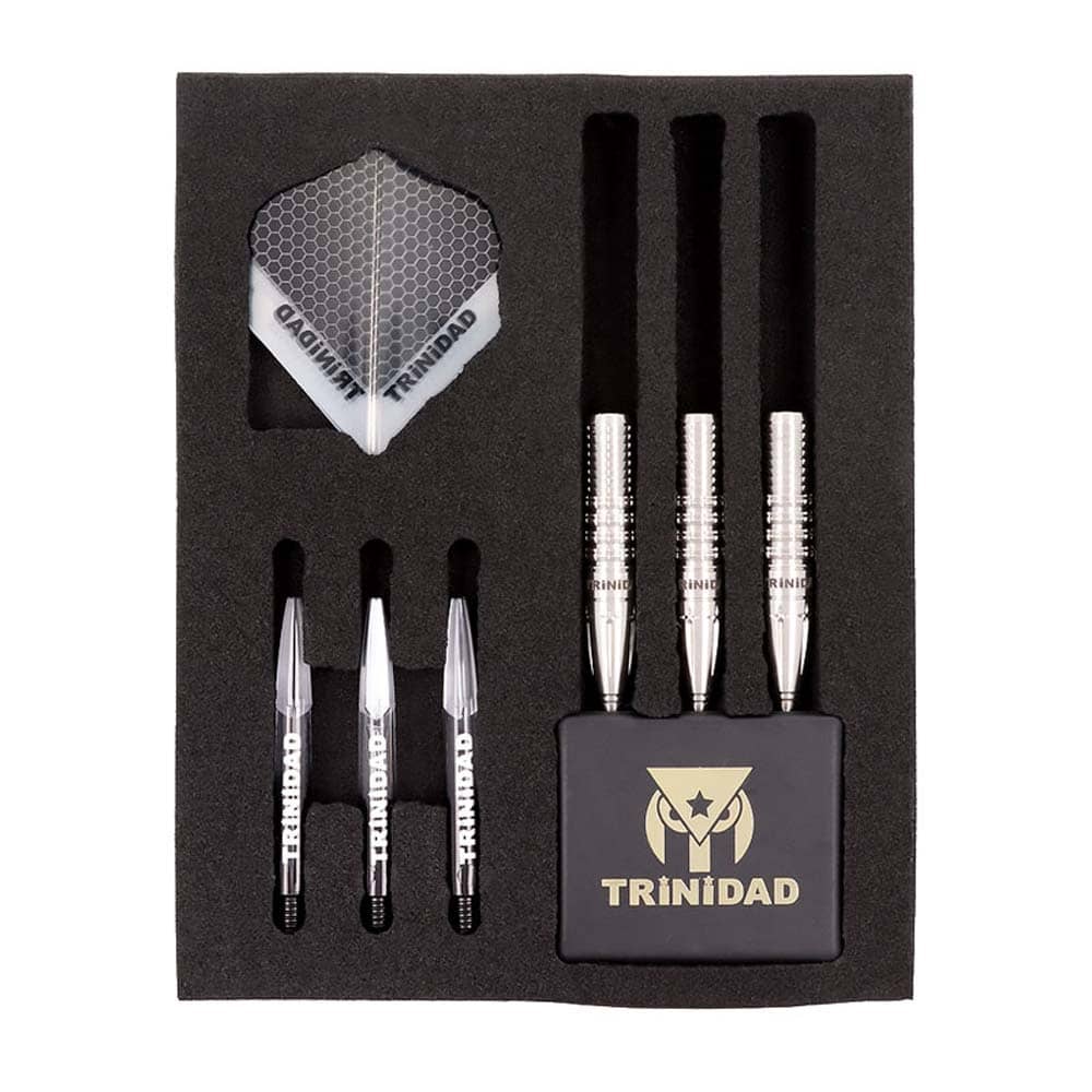 El juego de dardos se compone por 1 set de 3 cuerpos Carlos Type3 con punta de acero, 1 set de 3 plumas Trinidad y 1 set de 3 cañas Trinidad.
